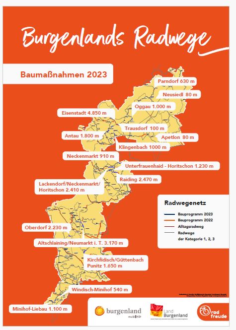 Ein Leuchtturmprojekt im letzten Jahr war die Errichtung der ersten Fahrradstraße des Burgenlandes von Lackendorf über Horitschon bis Neckenmarkt mit einer Gesamtlänge von rund 2,5 Kilometern. Auch im Südburgenland gibt es jetzt eine Fahrradstraße. Im Bereich des Flughafens in Punitz wurde am sehr beliebten Weinidylle Radweg B57 eine, die Landesstraße begleitende Radverbindung errichtet.