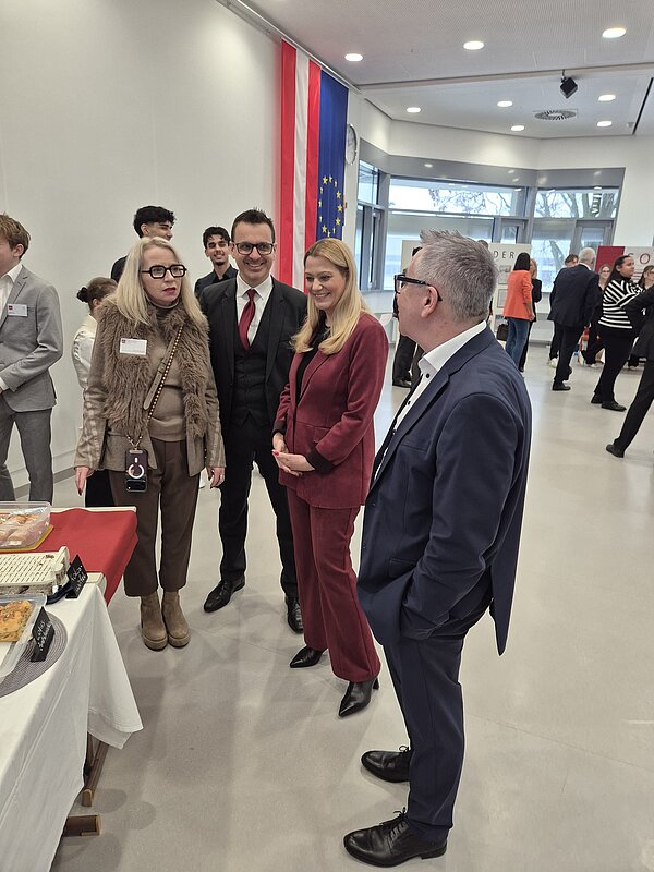 HAK Eisenstadt_02: Bildungslandesrätin Daniela Winkler und Direktor Reinhard Gaul im Gespräch mit Franz Bock, Leiter der Bildungsregion Nord.