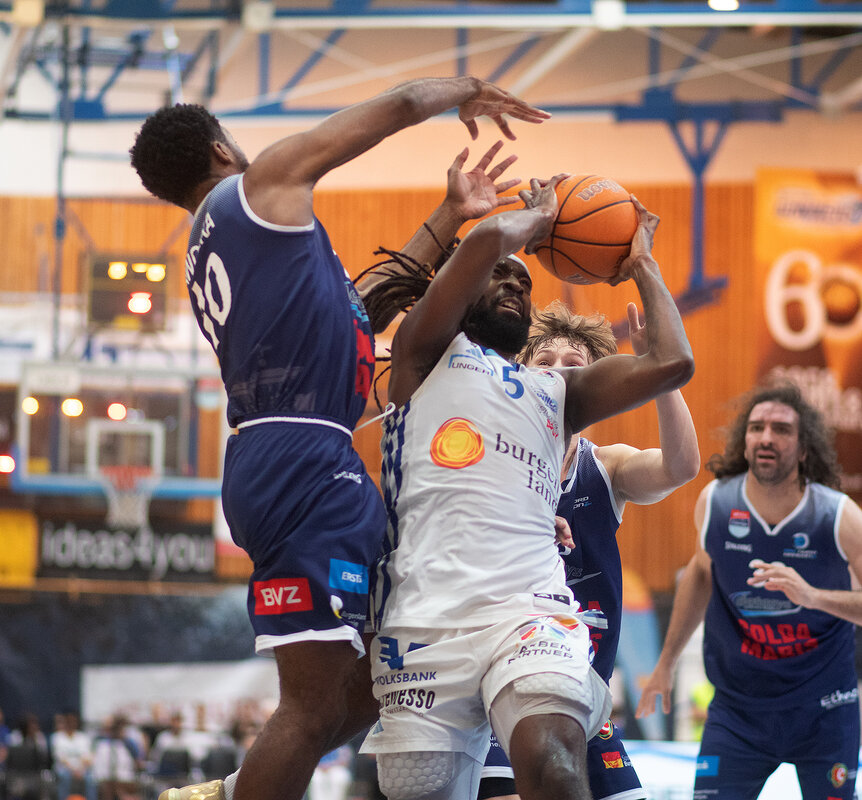 Bildtext Basketball-Superliga - Burgenland-Finale_5: Gunners-Forward Siegfried Rico Reid (r.) eroberte in dieser Szene den Ball von Dragonz-Guard Austen Awosika (l.).
