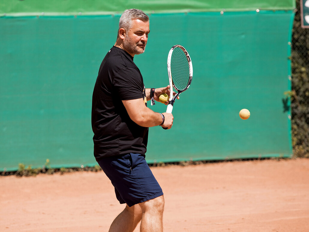 Bildtext Charity-Tennisturnier Sporthotel Kurz_4: Sport-Landesrat Heinrich Dorner spielte sich am Center-Court von Oberpullendorf für das Charity-Tennisturnier ein.