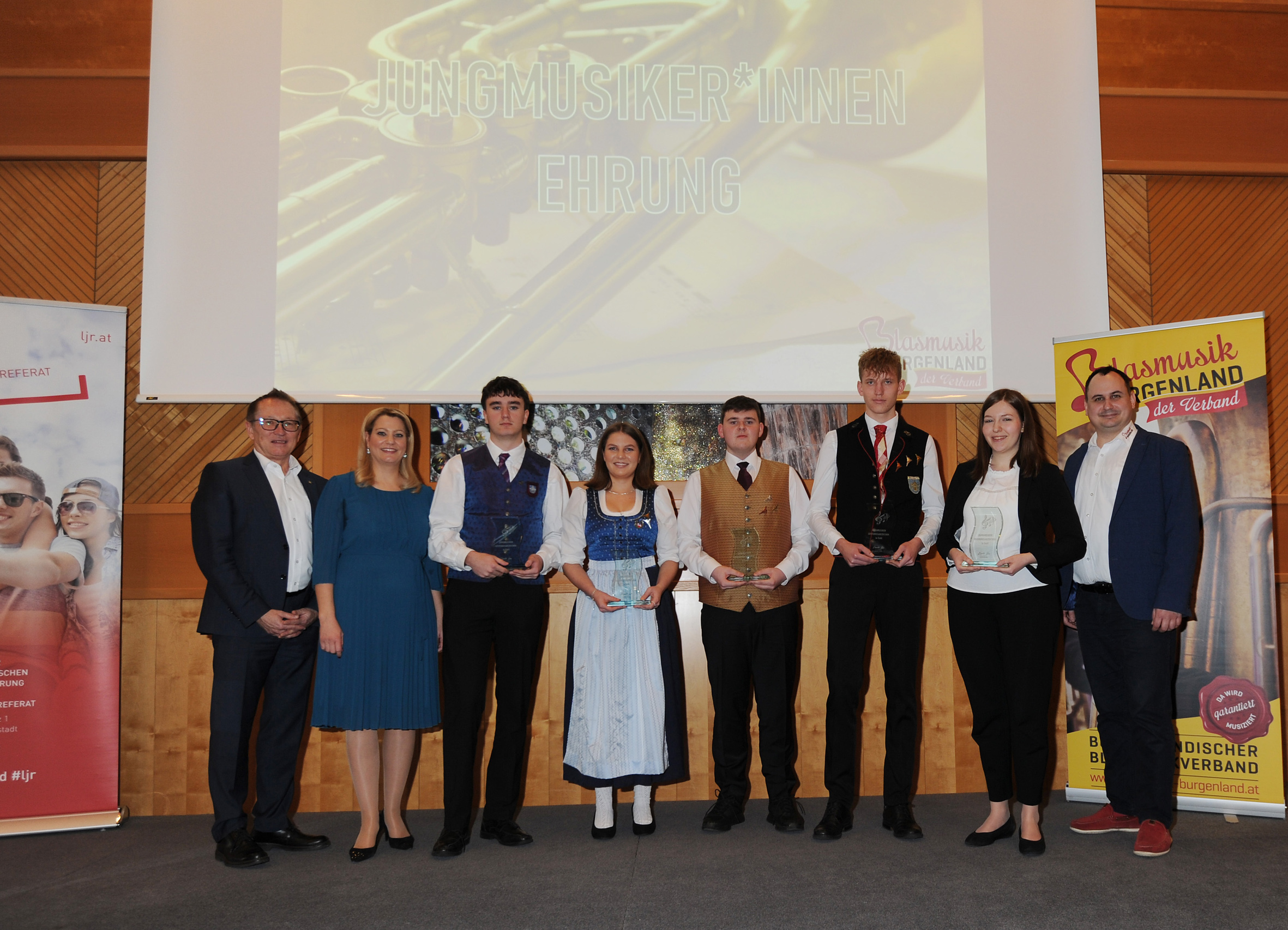 Bildtext LR Jungmusikerehrung WKO 01: DI Peter Reichstädter, Landesobmann des Burgenländischen Blasmusikverbandes, Elina Paeck, Andrea Krisam, Landesrätin Mag.a (FH) Daniela Winkler, Laura Kaltenecker, Tobias Preinsperger, Emely Krug und Márton Ilyés MEd BBA, Jugendreferent Blasmusikverband Burgenland.