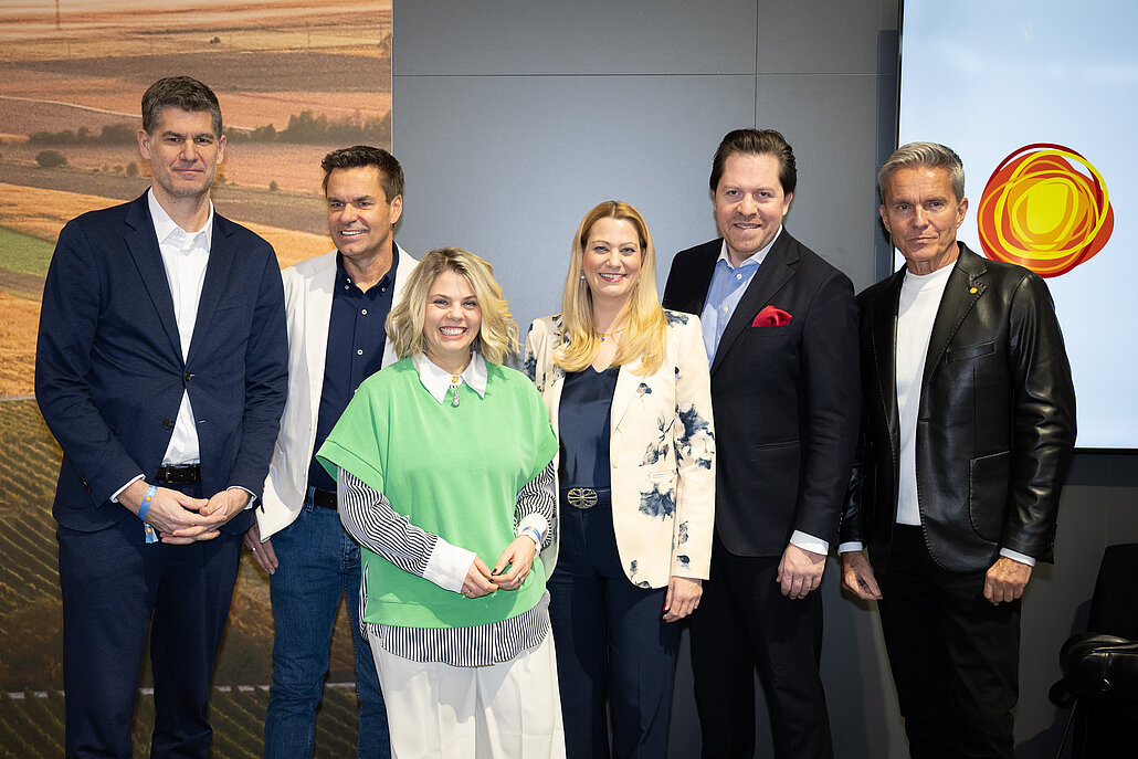 Bildtext Ferienmesse Wien 2026_1: Ein starker Start für das Burgenland bei der Ferien-Messe in Wien: Bernhard Neuhold (Geschäftsführer ÖFB), Didi Tunkel (GF Burgenland Tourismus), Claudia Priber (Geschäftsführerin Kulturbetriebe Burgenland), Landesrätin Daniela Winkler, Daniel Serafin (Intendant der Oper im Steinbruch) und Alfons Haider (Generalintendant der Kulturbetriebe Burgenland) (v.l.).