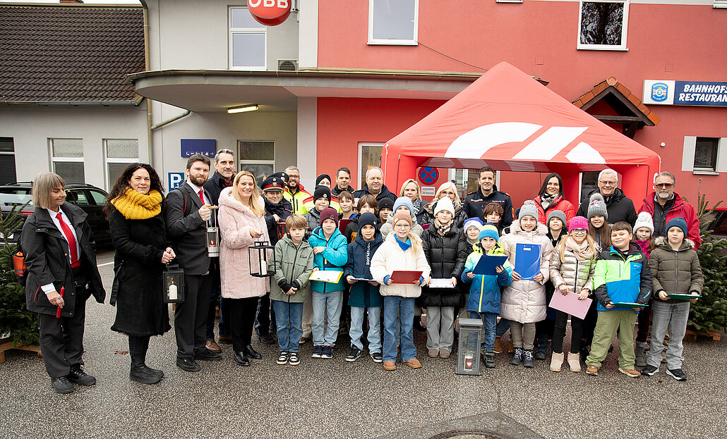 Bildtext Friedenslicht Eisenstadt_4 & 5: Die Kinder der Volksschule mit allen Beteiligten bei der Friedenslicht-Übernahme am Bahnhof in Eisenstadt