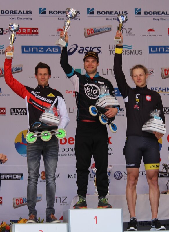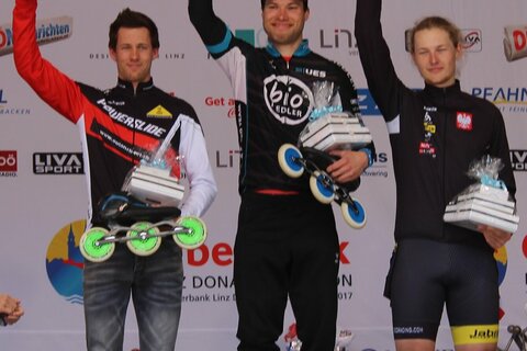 Johannes Hahnekamp vom UES Eisenstadt gewinnt in einer Zeit von 35:42 Minuten den Halbmarathon der Inlineskater in Linz vor Silvano Veraguth aus der Schweiz und Lukas Benedik aus der Slowakei.