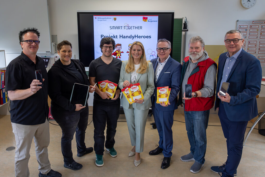 Die IT-Betreuerinnen und -Betreuer in den burgenländischen Pflichtschulen haben im Auftrag des Landes Burgenland und der Bildungsdirektion das Projekt „HandyHeroes“ ins Leben gerufen, das darauf abzielt, Kinder im Umgang mit digitalen Endgeräten und sozialen Medien zu sensibilisieren. Gemeinsam in der Klasse mit der Lehrperson sowie den Eltern und Erziehungsberechtigten erwerben die Schülerinnen und Schüler eine wesentliche Medienkompetenz, die heutzutage wichtiger denn je ist. „Smartphones und soziale Netzwerke sind aus dem Alltag unserer Kinder nicht mehr wegzudenken. Als Land Burgenland setzen wir jedoch nicht auf Verbote, sondern auf Bildung und Prävention. Mit dem neuen Vorzeigeprojekt ‚HandyHeroes‘ vermitteln wir unseren Volksschulkindern spielerisch die notwendige Medienkompetenz, um sich sicher in der digitalen Welt zu bewegen“, sagte Bildungslandesrätin Daniela Winkler bei der Präsentation dieses neuen Projekts gemeinsam mit Franz Bock, Leiter der Bildungsregion Nord und Schulqualitätsmanager in Vertretung von Bildungsdirektor Alfred Lehner, und dem Breitenbrunner Bürgermeister Helmut Hareter.