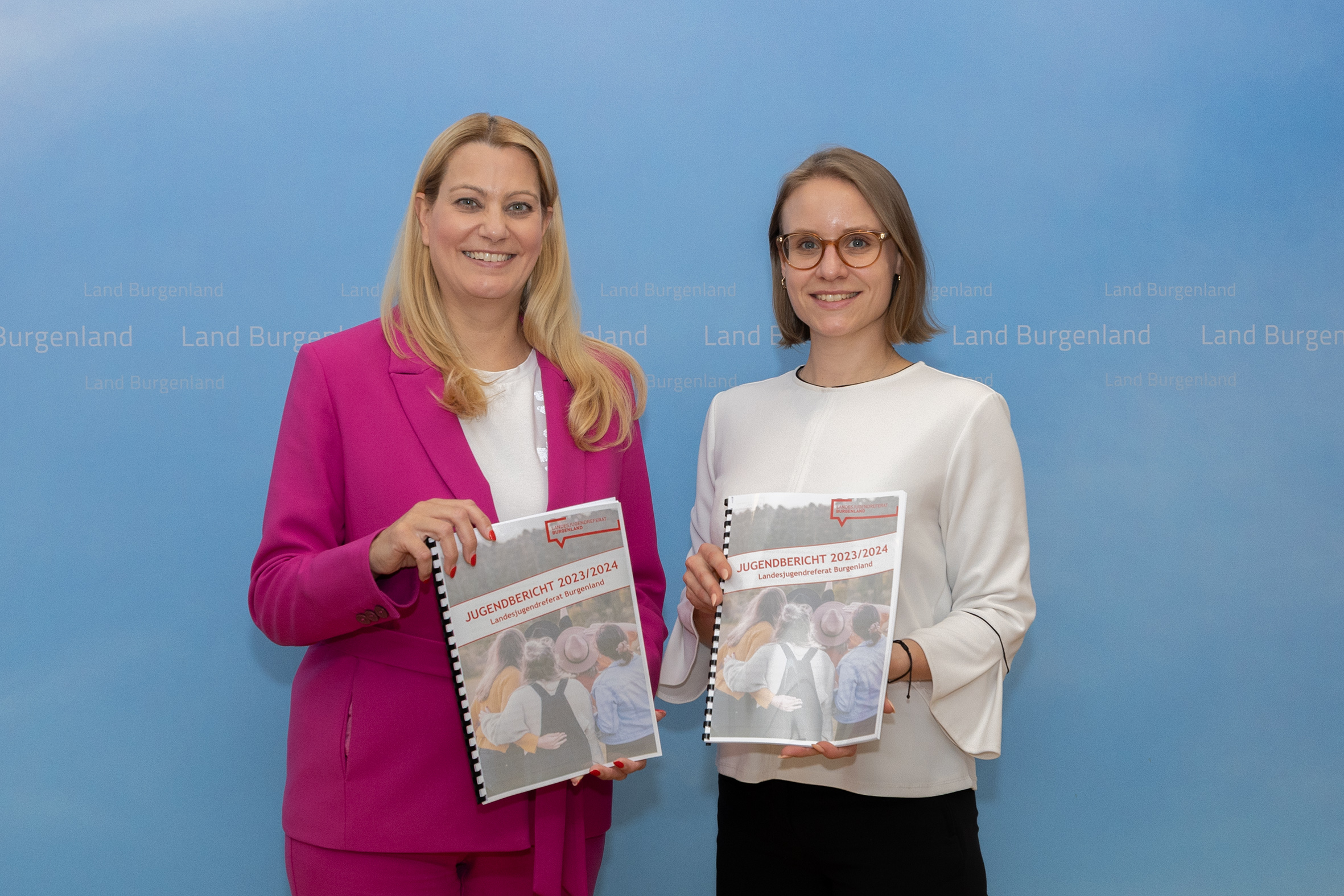 Bildtext Jugendbericht 2023-24: Bildungslandesrätin Mag.a (FH) Daniela Winkler und Referatsleiterin Mag.a Bianca Benedikt, MA (v.l.) präsentieren den neuen Jugendbericht 2023/24.