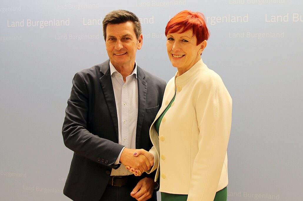 Bildtext Pflege Service Burgenland GmbH: Soziallandesrat Christian Illedits und die neue Geschäftsführerin der Pflege Service Burgenland GmbH Klaudia Friedl.
