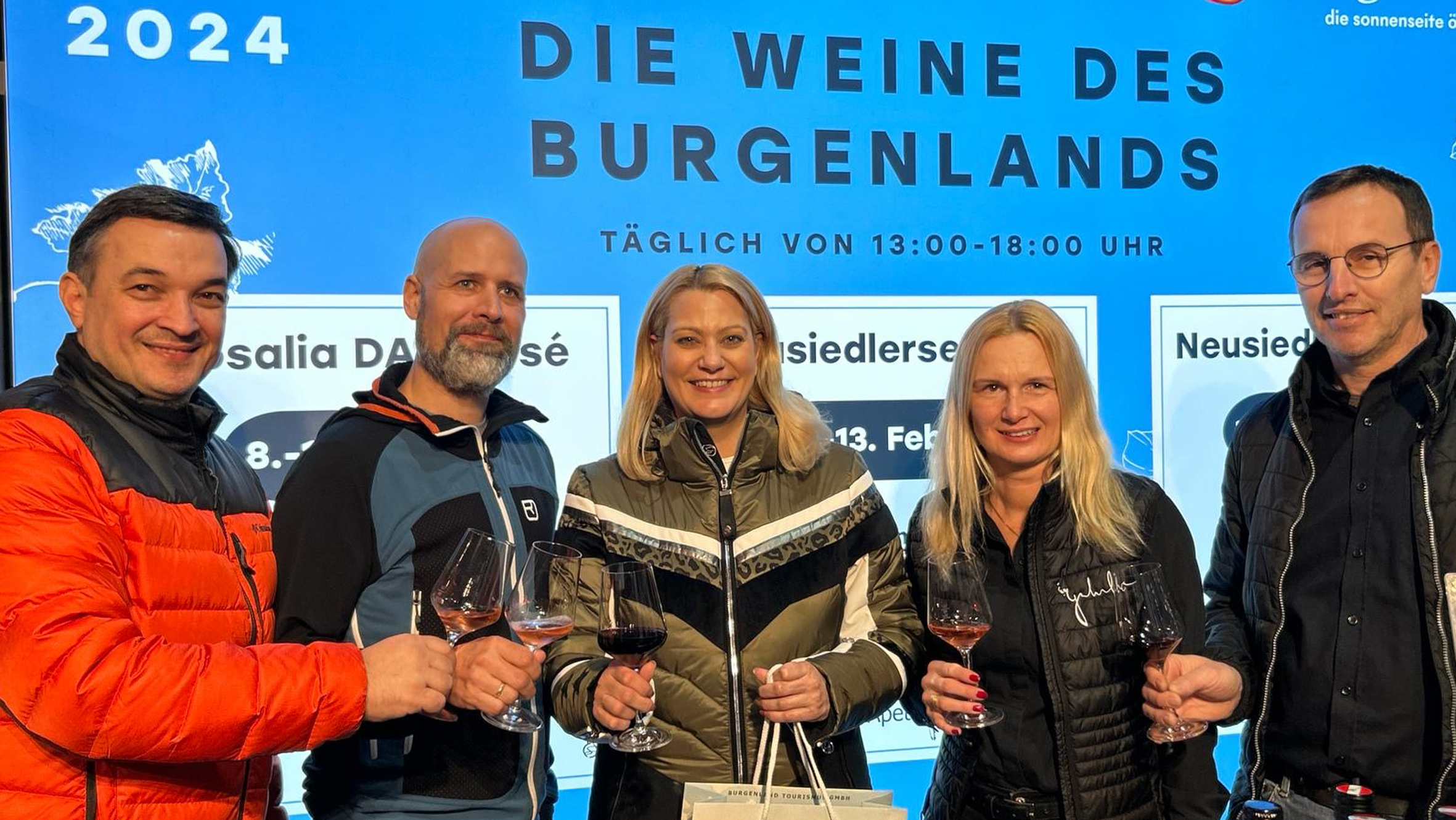 Bildtext 49. Burgenländische Skiwoche_1: Landesrätin Mag.a (FH) Daniela Winkler (Mitte) bei der Weinverkostung im Zuge der Burgenländischen Skiwoche.