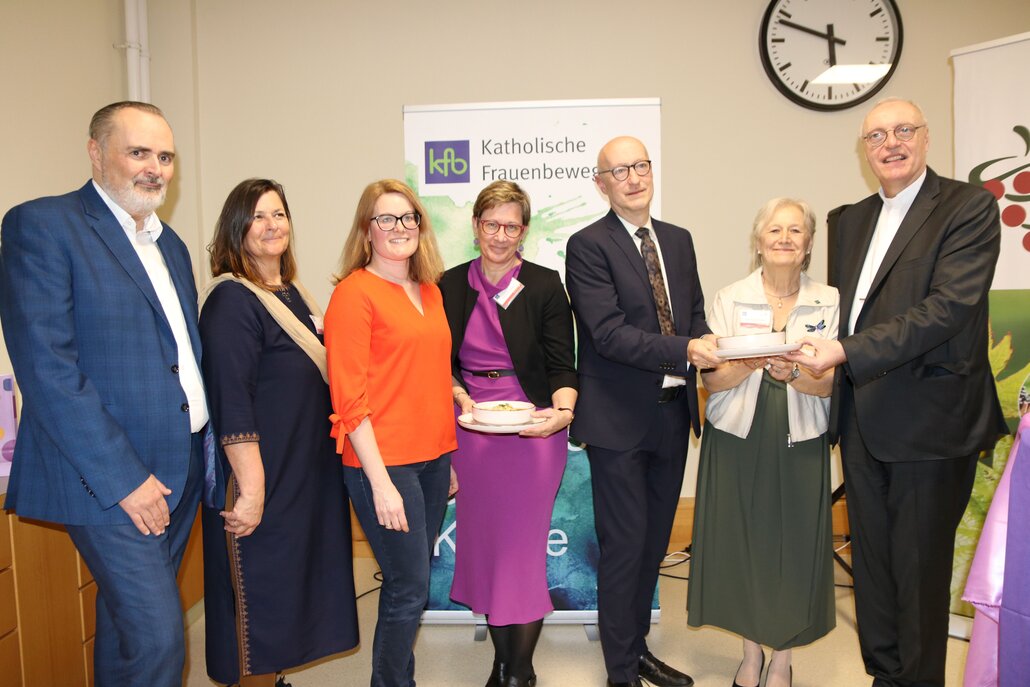Benefizsuppenessen_02: Landeshauptmann Hans Peter Doskozil, Superintendent Robert Jonischkeit und Bischof Ägidius Zsifkovics mit den Veranstalterinnen der Katholischen Frauenbewegung.