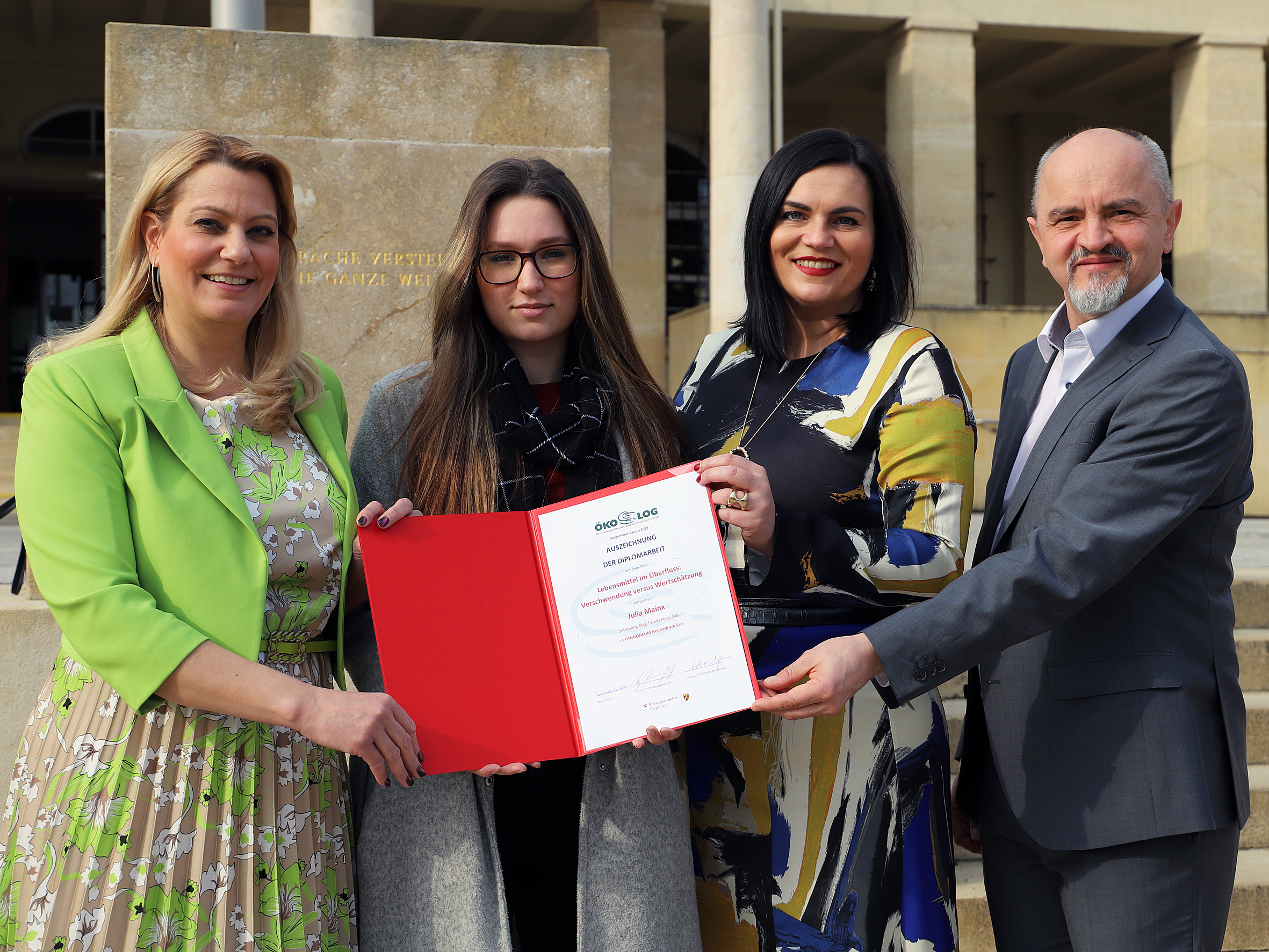 Die ehemalige Schülerin Julia Mainx verfasste bei Mag.a Polay-Lidl den Teil einer Diplomarbeit zum Thema "Ernährungskultur im Wandel der Zeit - Lebensmittel im Überschuss: Verschwendung versus Wertschätzung". Die Gewinnerin Julia Mainx erhielt im Zuge der Ehrung ein Preisgeld sowie ein Geschenk überreicht. „Aufgrund der vorherrschenden Klimakrise und der damit einhergehenden Herausforderungen müssen wir unser aller Verhalten grundlegend überdenken und Nachhaltigkeit mehr denn je leben. Innovative Arbeiten, wie die von Julia Mainx, leisten hierfür Pionierarbeit und können als Grundlage für weitere Forschungsarbeiten herangezogen werden. Sie ist damit eines der zahlreichen Vorbilder im burgenländischen Schulwesen. Ich danke allen Teilnehmerinnen und Teilnehmern dieses Bewerbes für ihr Engagement und hoffe, dass noch zahlreiche Kinder und Jugendliche einen Ansporn im Sinne einer lebenswerten Zukunft darin finden werden“, so Bildungsdirektor Mag. Heinz Josef Zitz.