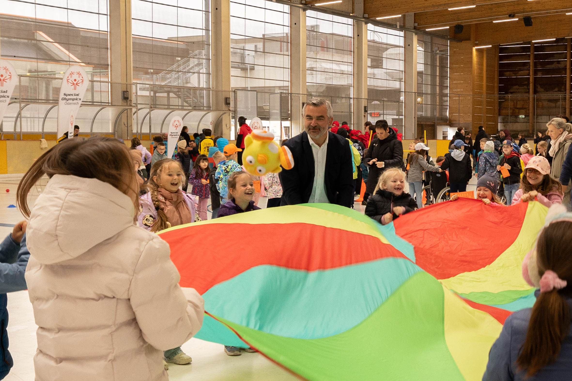 Landesrat Mag. Heinrich Dorner mit Kindern bei einer der Stationen des 23. Inklusiven Spiel- und Sportfestes der Sportunion Burgenland in Eisenstadt.