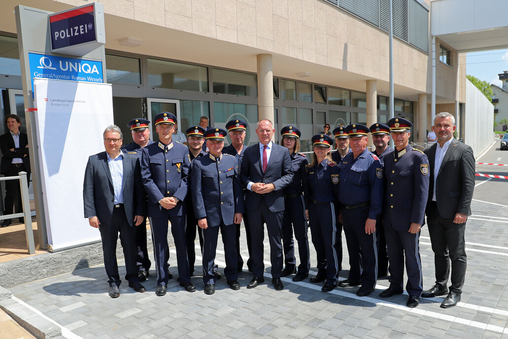 Bildtext Eröffnung Polizeiinspektion Horitschon_3: Landesrat Mag. Heinrich Dorner (r.) mit Bundesminister Mag. Gerhard Karner und Bürgermeister Gerhard Petschowitsch, BA, MSc (l.), Landespolizeiinspektor Mag. Martin Huber (2.v.r., vorne), Postenkommandant, Kontrollinspektor Georg Schedl (3.v.l., vorne) und den Polizistinnen und Polizisten der neuen Polizeiinspektion in Horitschon.