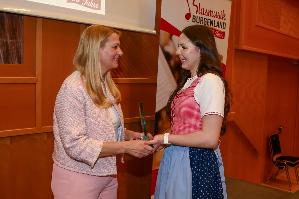 Im Festsaal der Wirtschaftskammer in Eisenstadt wurden am Freitagabend erfolgreiche burgenländische Jungmusikerinnen und Jungmusiker für ihre herausragenden musikalischen Leistungen geehrt. Ausgezeichnet wurden jene jungen Talente, die im vergangenen Jahr das Jungmusiker-Leistungsabzeichen in Gold oder Silber erfolgreich abgelegt haben. Die Ehrung nahm Jugendlandesrätin Daniela Winkler gemeinsam mit dem Landesobmann des Burgenländischen Blasmusikverbandes, Peter Reichstädter, der Landesjugendreferentin des Blasmusikverbandes, Laura Arzberger, sowie dem Landeskapellmeister der Blasmusik Burgenland und Kapellmeister der Militärmusik Burgenland, Hans Kausz, vor. Winkler gratulierte den Ausgezeichneten zu ihren Leistungen und verwies auf das Engagement zahlreicher Akteurinnen und Akteure – „den Funktionärinnen und Funktionären des Musikwesens auf Verbandsebene und in den Vereinen mit ihren zahlreichen ehrenamtlich Mitwirkenden vor Ort, den Pädagoginnen und Pädagogen und natürlich ganz besonders den ausgezeichneten jungen Musikerinnen und Musikern sowie ihren Familien, die sie auf dem Weg zu diesen herausragenden Leistungen unterstützt haben.“ Organisiert wurde die Verleihung vom Landesjugendreferat in Zusammenarbeit mit dem Burgenländischen Blasmusikverband.