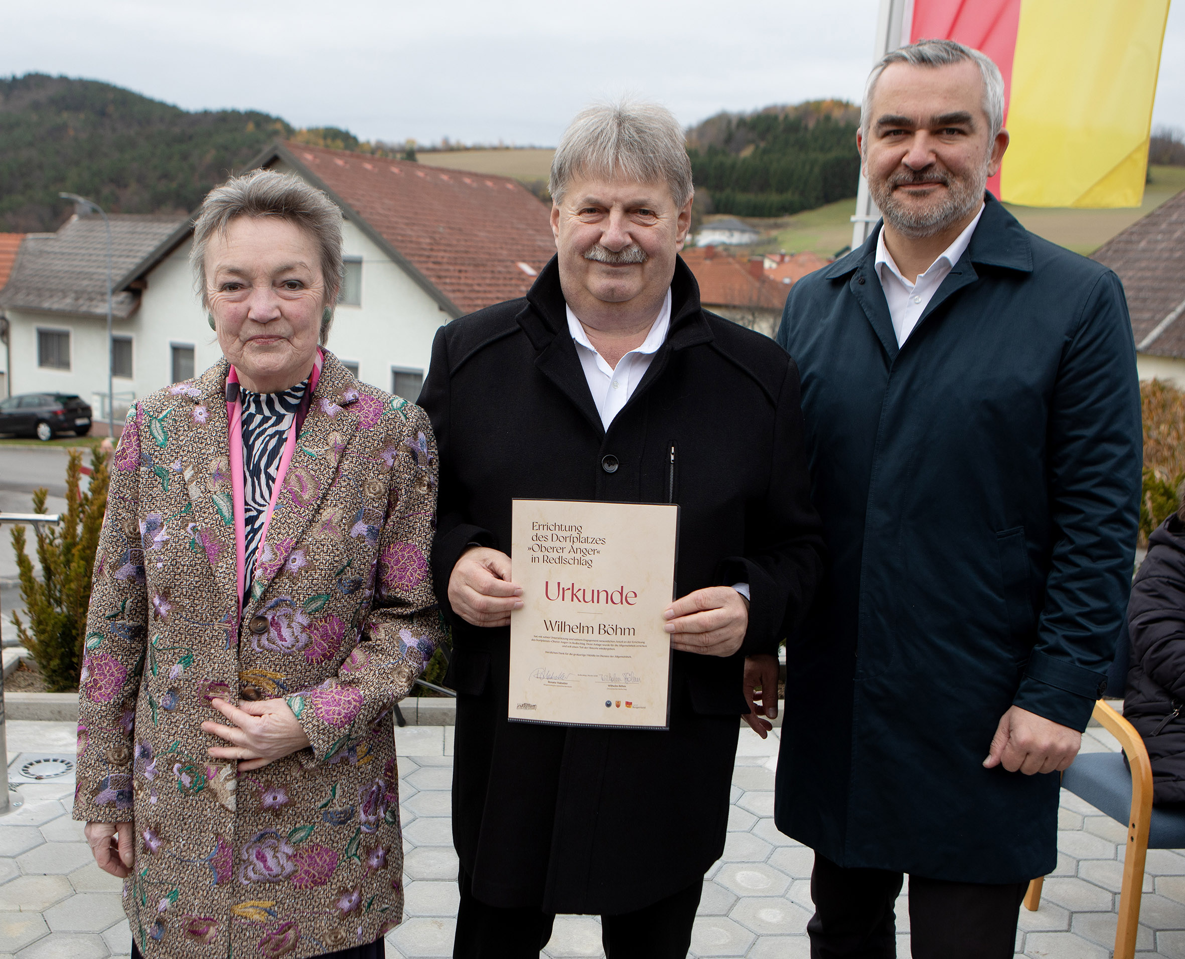 Bildtext Eröffnung Dorfplatz Redlschlag_2: Vizebürgermeister, Ortsvorsteher von Redlschlag, Wilhelm Böhm (Mitte) bekam von Landesrat Heinrich Dorner und Bürgermeisterin Renate Habetler als ehrenamtlicher Mitarbeiter des neuen Dorfplatzes eine Ehrenurkunde überreicht.