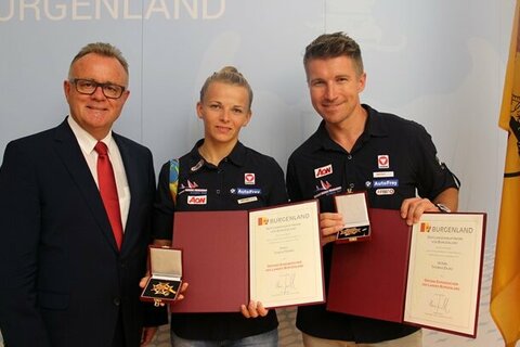 Das burgenländische Segelduo Thomas Zajac und Tanja Frank hat bei den Olympischen Spielen in Rio Bronze im Nacra 17 geholt. Die Segelstars des ASVÖ Burgenland haben damit die acht Jahre dauernde rot-weiß-rote Medaillen-Durststrecke erfolgreich beendet. LH Niessl überreicht den Olympia-Bronzemedaillengewinner Frank und Zajac das große Ehrenzeichen des Landes Burgenlandes ***