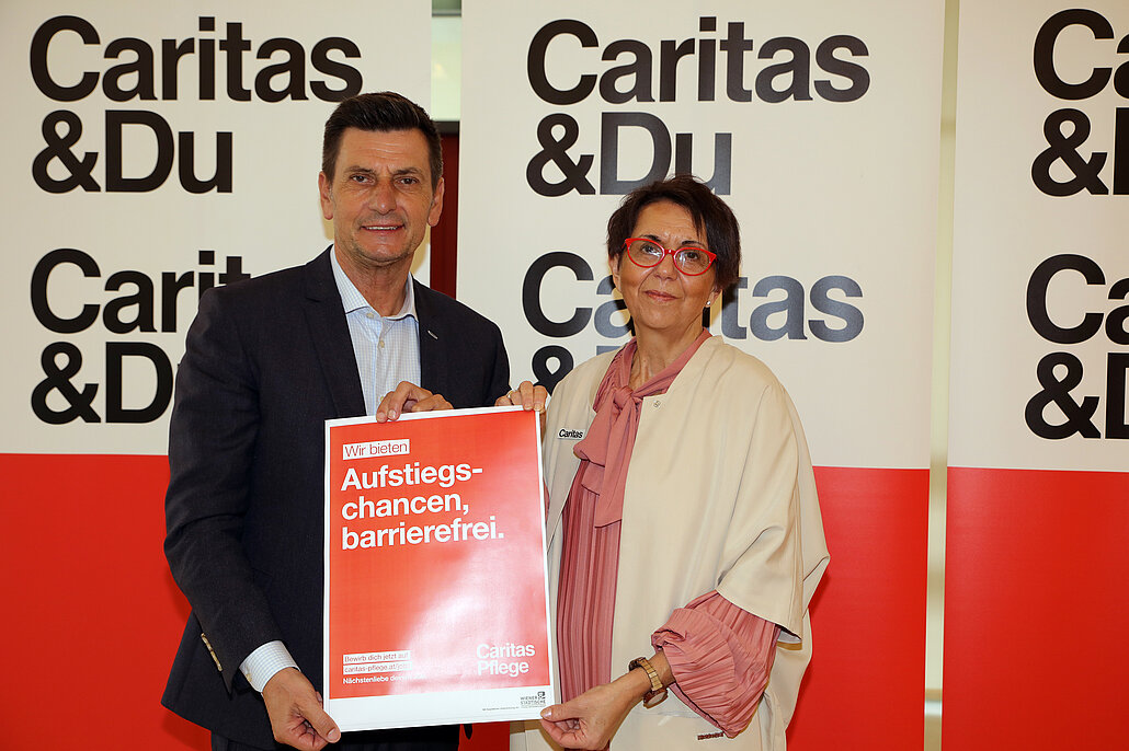 Bildtext „Land Burgenland Caritas Pflege“: Soziallandesrat Christian Illedits und Caritas Burgenland Direktorin Edith Pinter verfolgen im Pflegebereich ein gemeinsames Ziel