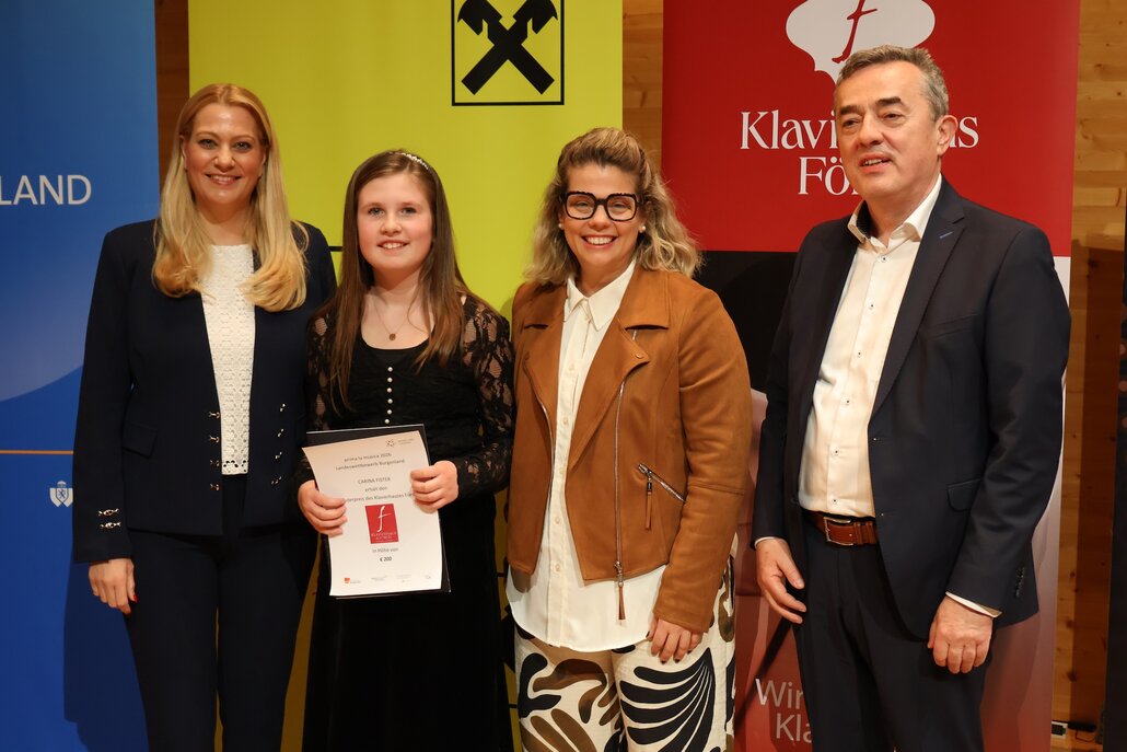Bildtext Prima_La_Musica_001 (v.l.n.r.): Landesrätin Daniela Winkler, Preisträgerin Carina Fister (Klavier), Kulturbetriebe-Burgenland-Geschäftsführerin Claudia Priber und Franz Fellinger (Geschäftsführer Klavierhaus Förstl)