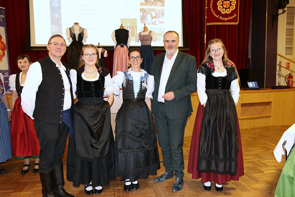 Bildtext Trachtenpräsentation_01: Matthias Beck, Obmann des Volkstanzverbandes Burgenland (im Bild links), Trachtenreferentin Sibylle Tschürtz (Bildmitte) und Landeshauptmann Hans Peter Doskozilmit den Teilnehmerinnen aus Markt Allhau.