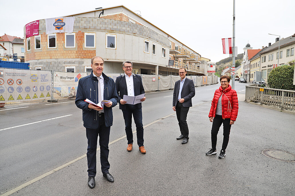 Bildtext Baustellenbesichtigung Betreutes Wohnen: Landesrat Leonhard Schneemann machte sich mit OSG-Geschäftsführer Alfred Kollar, Bürgermeister Andreas Gradwohl und Gemeindevorständin Ingeborg Pehm (v.l.) ein Bild von der Baustelle im Ortszentrum von Sieggraben.