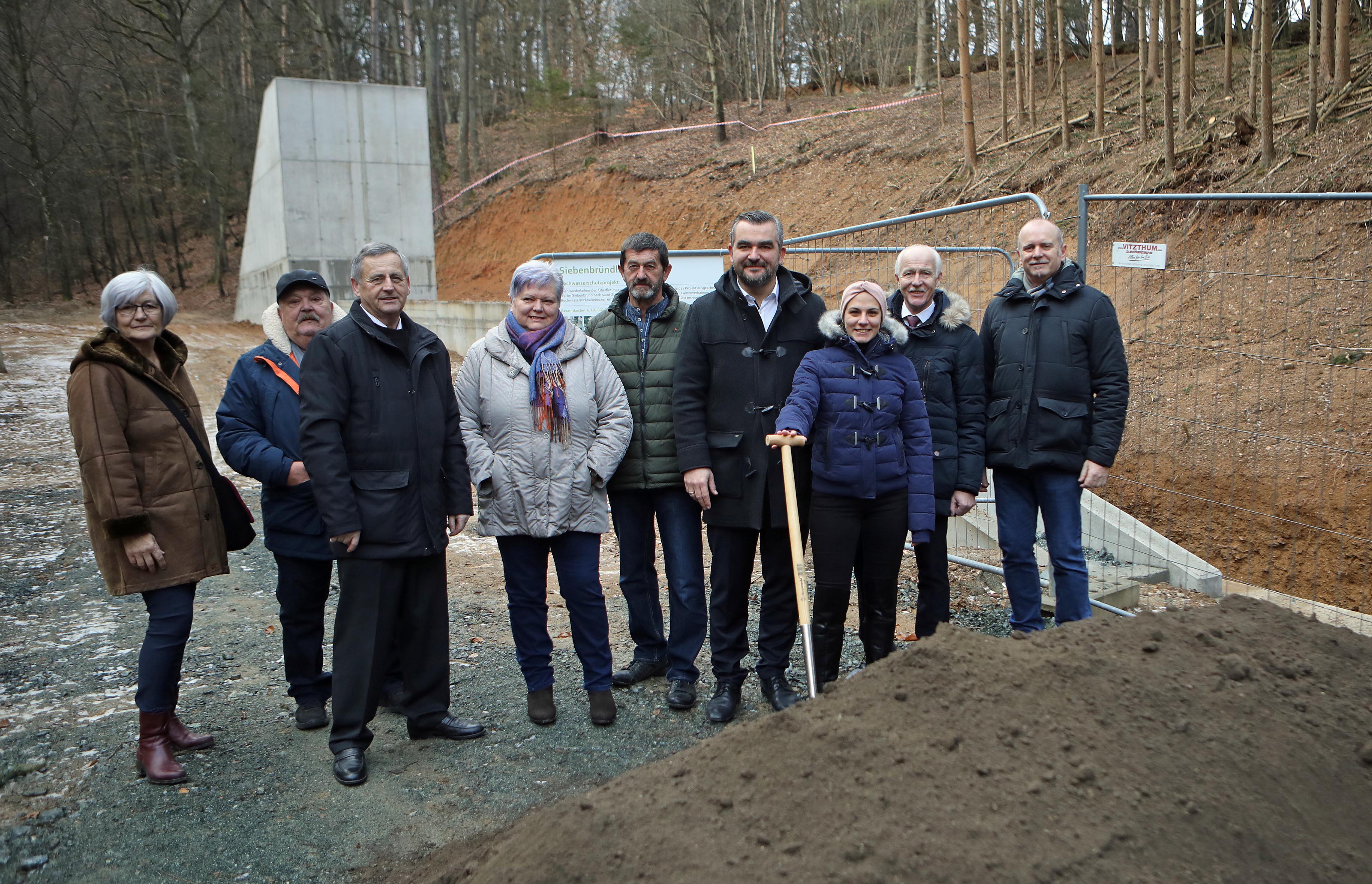 Landesrat Heinrich Dorner, Bürgermeister Johann-Georg Horvath, Nationalrat Dipl.-Ing. Nikolaus Berlakovich, Baudirektor Wolfgang Heckenast und DI Christian Amberger vom Bundesministerium stellten danach das Projekt der Gemeindebevölkerung vor. Die Errichtung der drei Hochwasserrückhaltebecken sowie die Eindeckung des Siebenbründlbaches in Form eines Kastengerinnes sollen bis Dezember 2023 abgeschlossen sein.