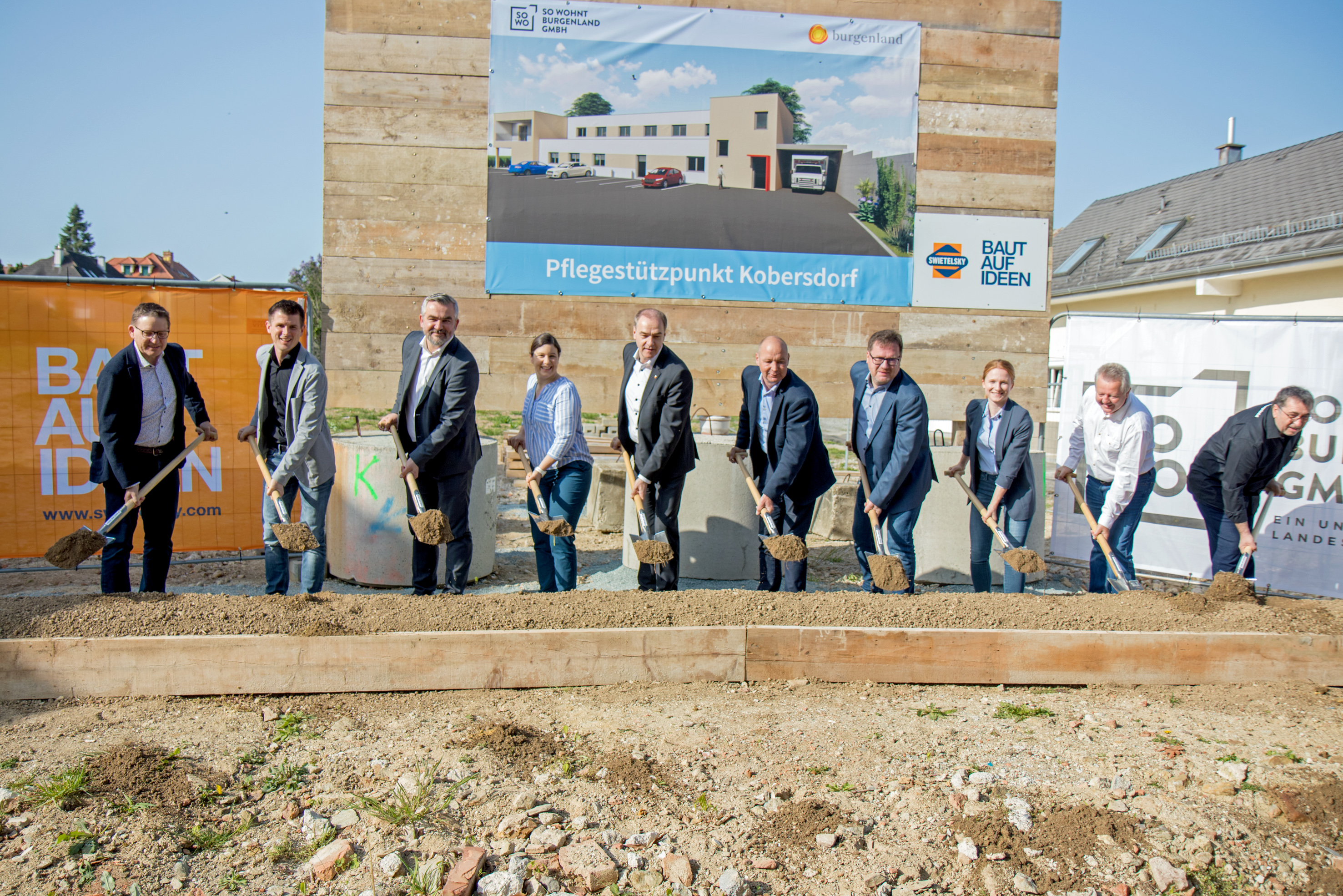 Mit seinem neuen wohnortnahen Pflegemodell und der Einrichtung von 71 Pflegestützpunkten nimmt das Burgenland europaweit eine Vorreiterrolle ein. Heute, Freitag, erfolgte in Kobersdorf der Baustart für den ersten Pflegestützpunkt im Bezirk Oberpullendorf. Dieser soll als Hauptstützpunkt für die Region fungieren und wird von der So Wohnt Burgenland GmbH (SOWO), eine Tochtergesellschaft der Landesimmobilien Burgenland GmbH (LIB), errichtet. Der Stützpunkt soll neben vier Betreuten Wohneinheiten auch ein umfassendes Angebot inklusive Tagesbetreuung für bis zu zwölf Personen sowie Pflege- und Sozialberatung umfassen und als Basis für die mobile Hauskrankenpflege dienen. Die Landesräte Leonhard Schneemann und Heinrich Dorner nahmen gemeinsam mit LIB-Geschäftsführer Gerald Goger, Bürgermeister Andreas Tremmel, SOWO-Geschäftsführerin Melanie Piskernik und den beteiligten Gewerken den Spatenstich vor.