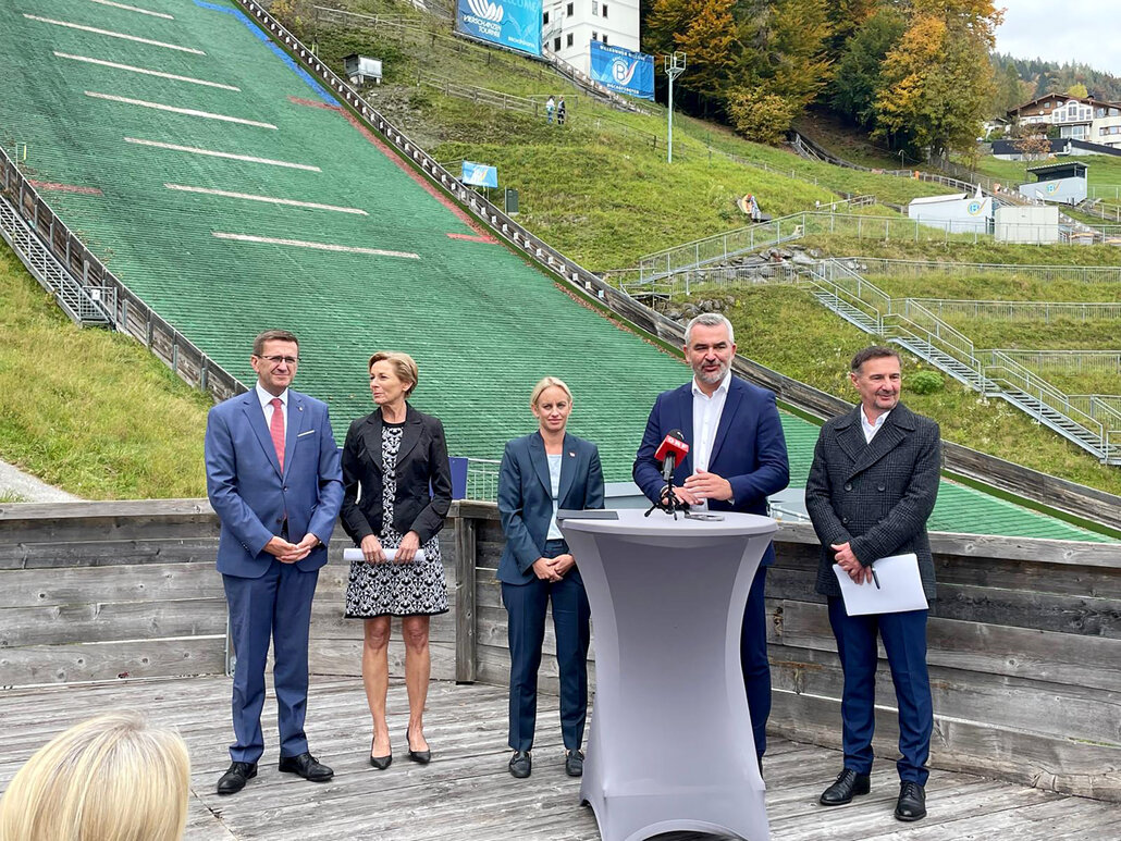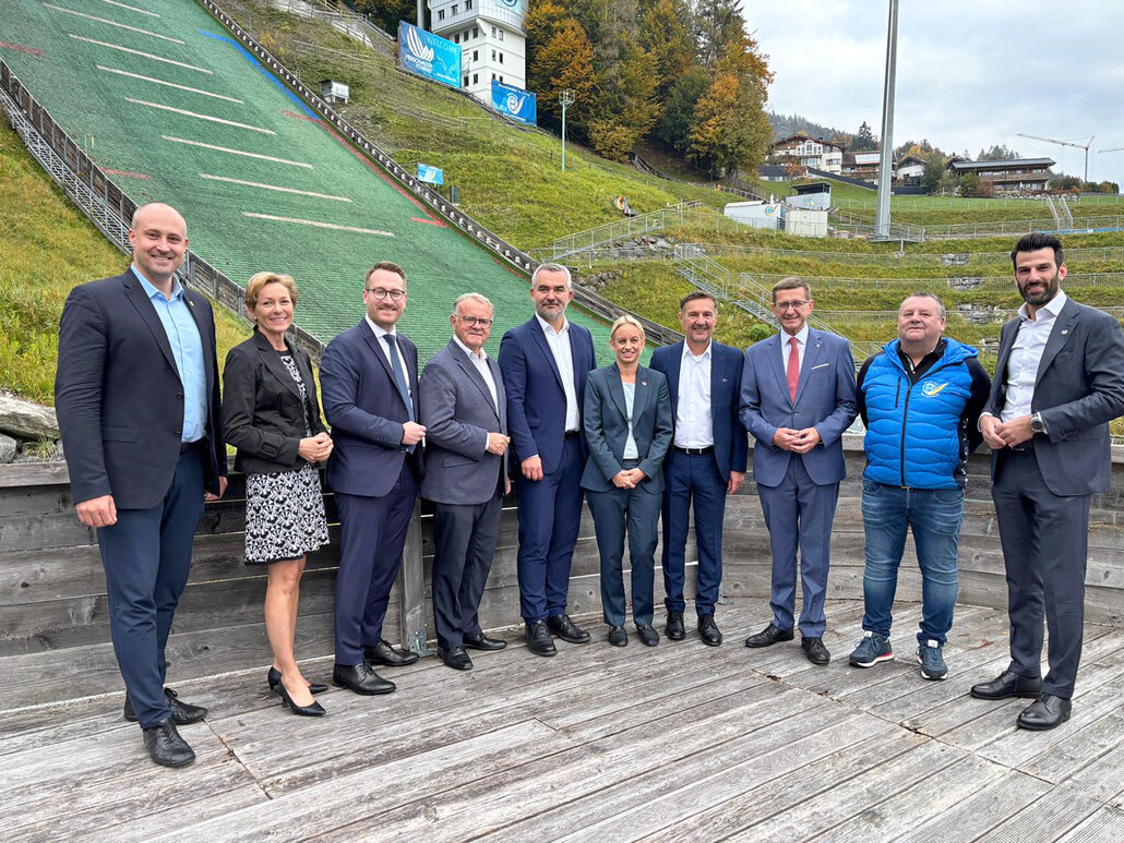 Bildtext Sportrefentenkonferenz 1: Sportlandesrat Heinrich Dorner mit seinen Amtskollegen, mit Sport Austria-Präsident Hans Niessl und Sportstaatssekretärin Michaela Schmidt vor der Sprungschanze in Bischofshofen.