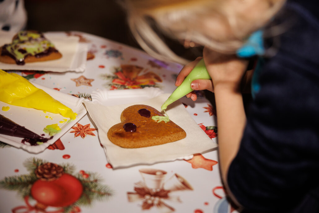 19:00 Uhr können Kinder Lebkuchen verzieren, während zeitgleich der Nikolo über das Gelände