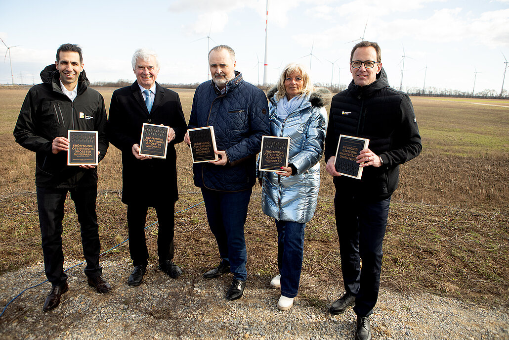 Bildtext Windpark Neusiedl-Weiden 1 bis 11: Landeshauptmann Hans Peter Doskozil gemeinsam mit Infrastrukturminister Peter Hanke, Bürgermeisterin Landtagsabgeordnete Elisabeth Böhm, Weidens Bürgermeister Heinrich Hareter sowie Stephan Sharma, CEO der Burgenland Energie und Reinhard Czerny, Finanzvorstand, FFO der Burgenland Energie beim Startschuss des größten Windparks Österreichs in Neusiedl/Weiden.