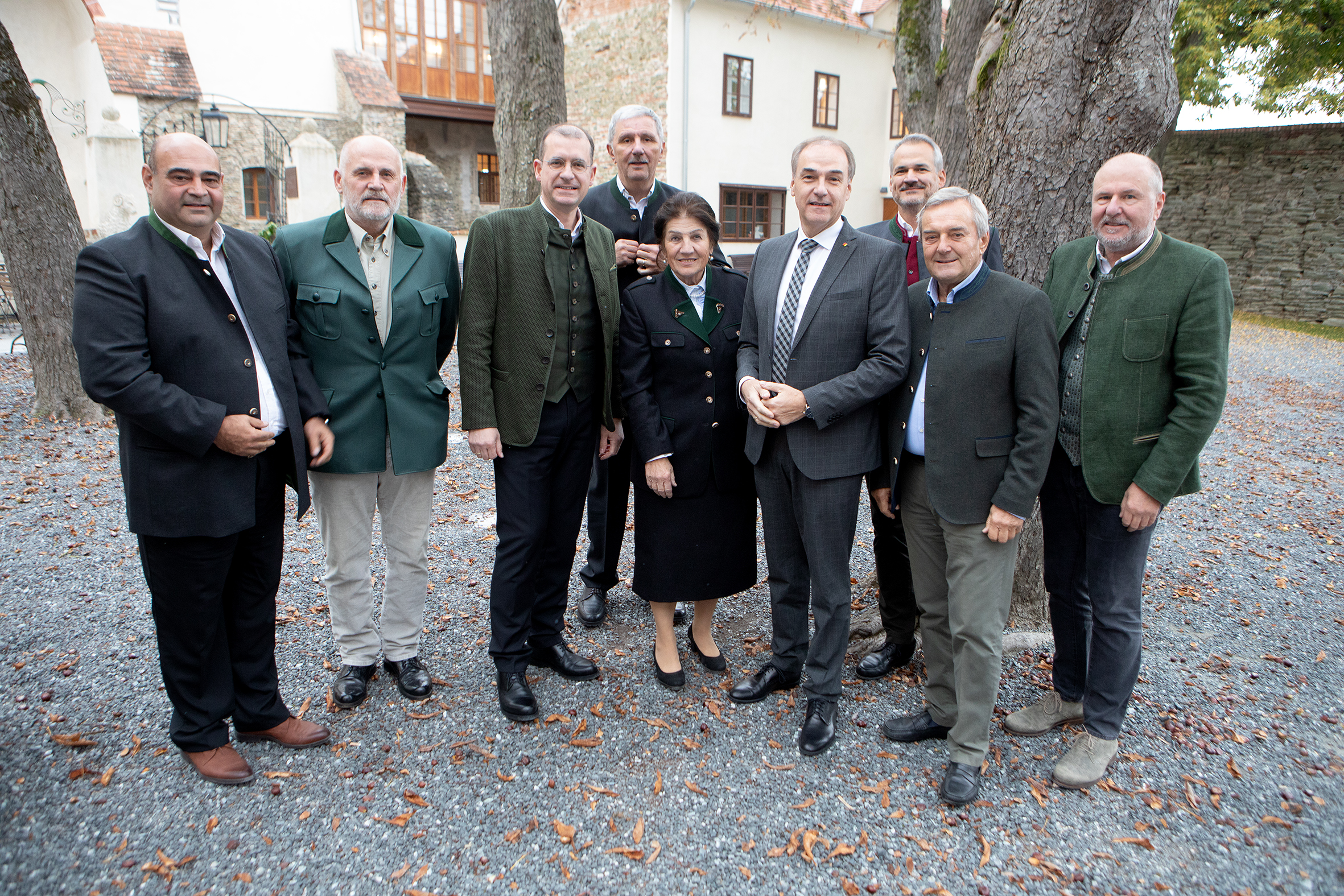 Bildtext Hegeringleiter-Empfang_2: Landesrat Dr. Leonhard Schneemann (4.v.r.) mit den Bezirksjägermeistern Hannes Mosonyi (Neusiedl am See), Wirklicher Hofrat DI Gernot Kainz (Eisenstadt), Landesjagdkoordinator DI Hans Peter Weiss, Bezirksjägermeister Kammerrat Siegfried Fleischhacker (Oberwart), Dr. Charlotte Klement (Güssing), Referatsleiter Förster Ing. Roman Bunyai, MA, Ing. Reinhard Knaus (Jennersdorf) und Kammerrat Anton Putz (Oberpullendorf) (v.l.).
