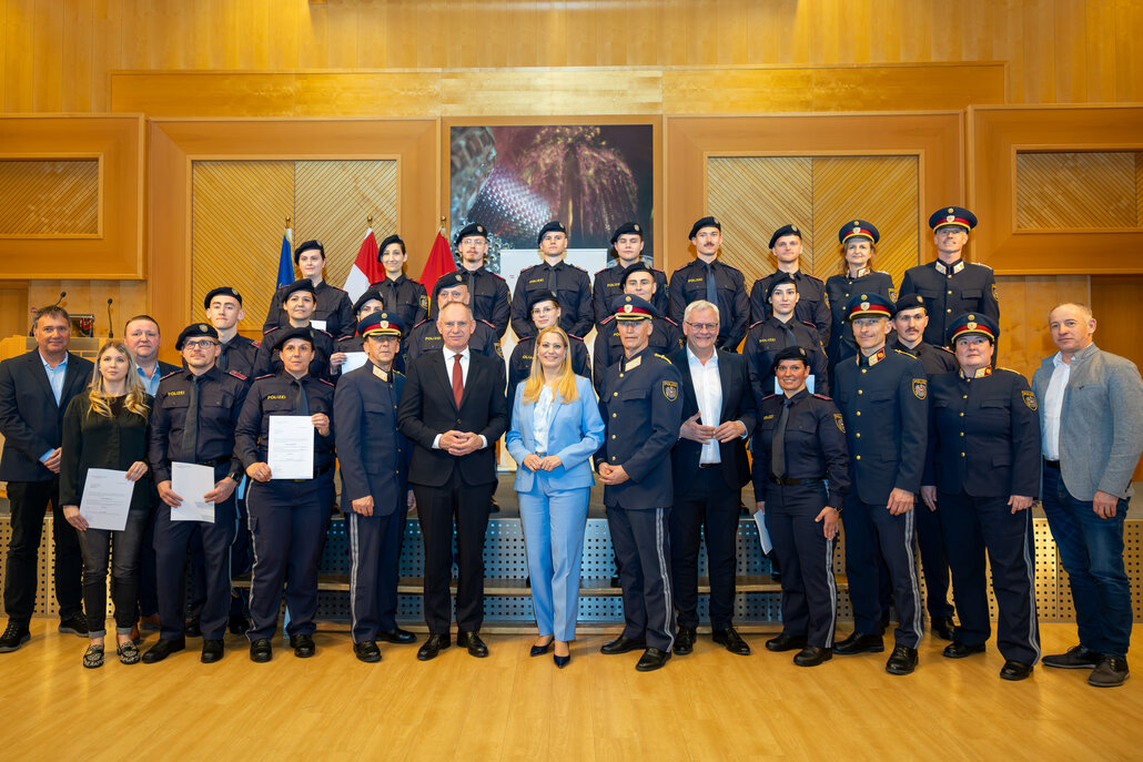 Die Polizei im Burgenland hat mit dem heutigen Tag 39 Polizistinnen und Polizisten mehr im Einsatz. Zwei Ausbildungsklassen wurden nach Abschluss der Grundausbildung im Festsaal der Wirtschaftskammer im Beisein von Innenminister Gerhard Karner, Landesrätin Daniela Winkler, in Vertretung des Landeshauptmannes Hans Peter Doskozil, und Landespolizeidirektor Martin Huber feierlich ausgemustert, und den jungen Kolleginnen und Kollegen wurden ihre Dekrete überreicht. Im Anschluss wurde das neu errichtete Cybercrime-Training-Center offiziell seiner Bestimmung übergeben. „Sicherheit ist neben Gesundheit das wichtigste Bedürfnis der Menschen. Die Herausforderungen für die Polizei werden immer größer, und das Betätigungsfeld wird immer breiter. Dazu braucht es gut ausgebildete Beamte“, sagte die Landesrätin.