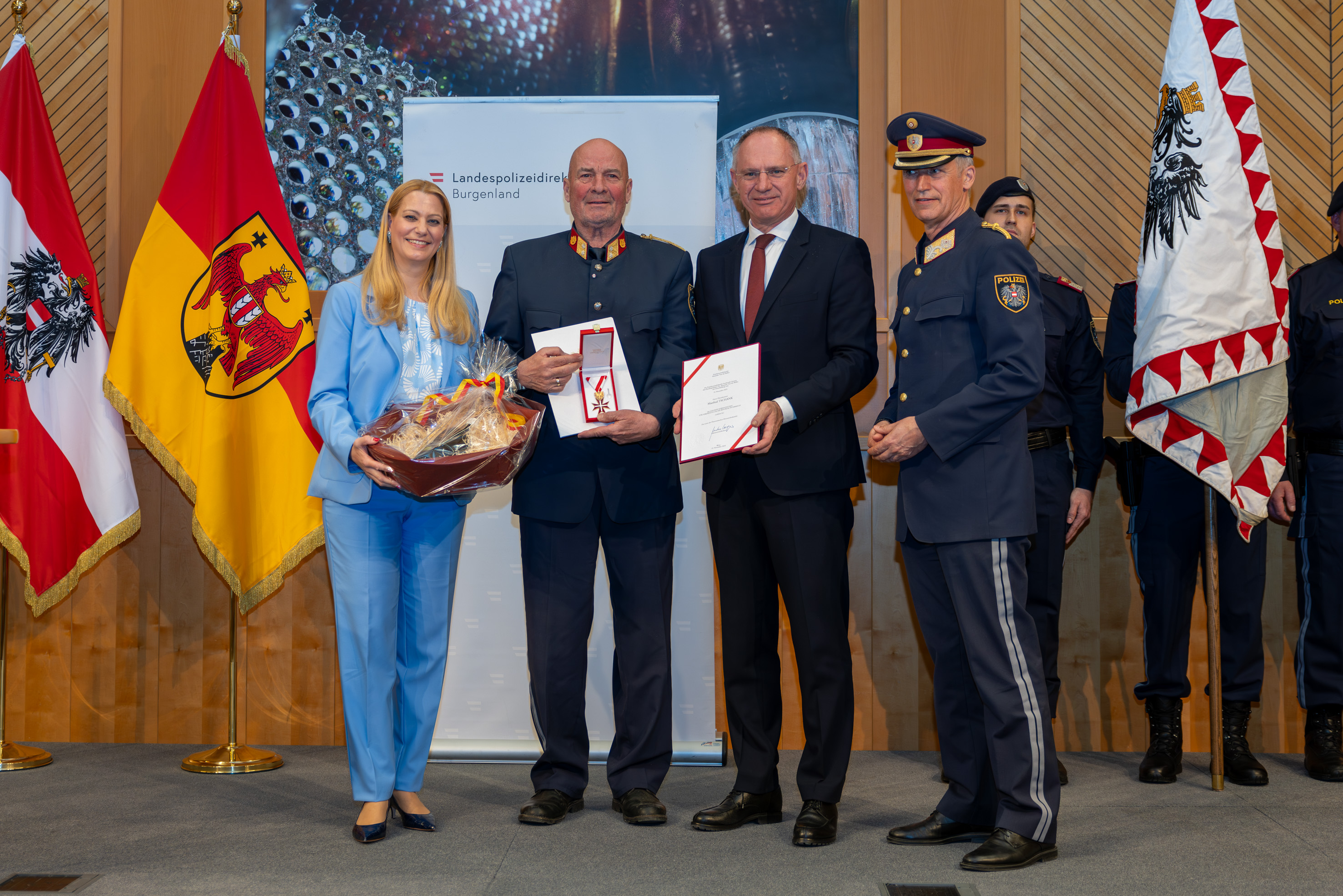 Bildtext Ehrung Tschank: Oberstleutnant Manfred Tschank erhielt das goldene Ehrenzeichen für Verdienste um die Republik Österreich. Auf dem Foto: Landesrätin Daniela Winkler, Manfred Tschank, Innenminister Gerhard Karner und Landespolizeidirektor Martin Huber (v.l.).