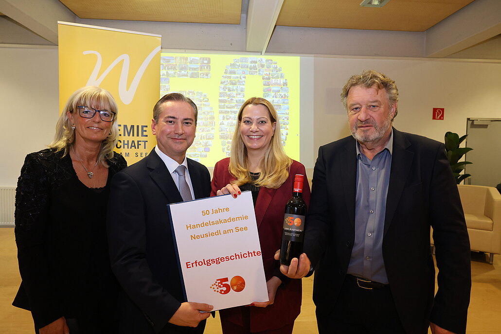 Bildtext 50 Jahre HAK Neusiedl am See: Bildungslandesrätin Mag.a (FH) Daniela Winkler (2.v.r.), Bildungsdirektor Alfred Lehner (r.) und Landtagsabgeordnete Bürgermeisterin Elisabeth Böhm (l.) gratulierten Direktor Hannes Nitschinger (2.v.l.) und seiner HAK Neusiedl zum 50-jährigen Jubiläum.