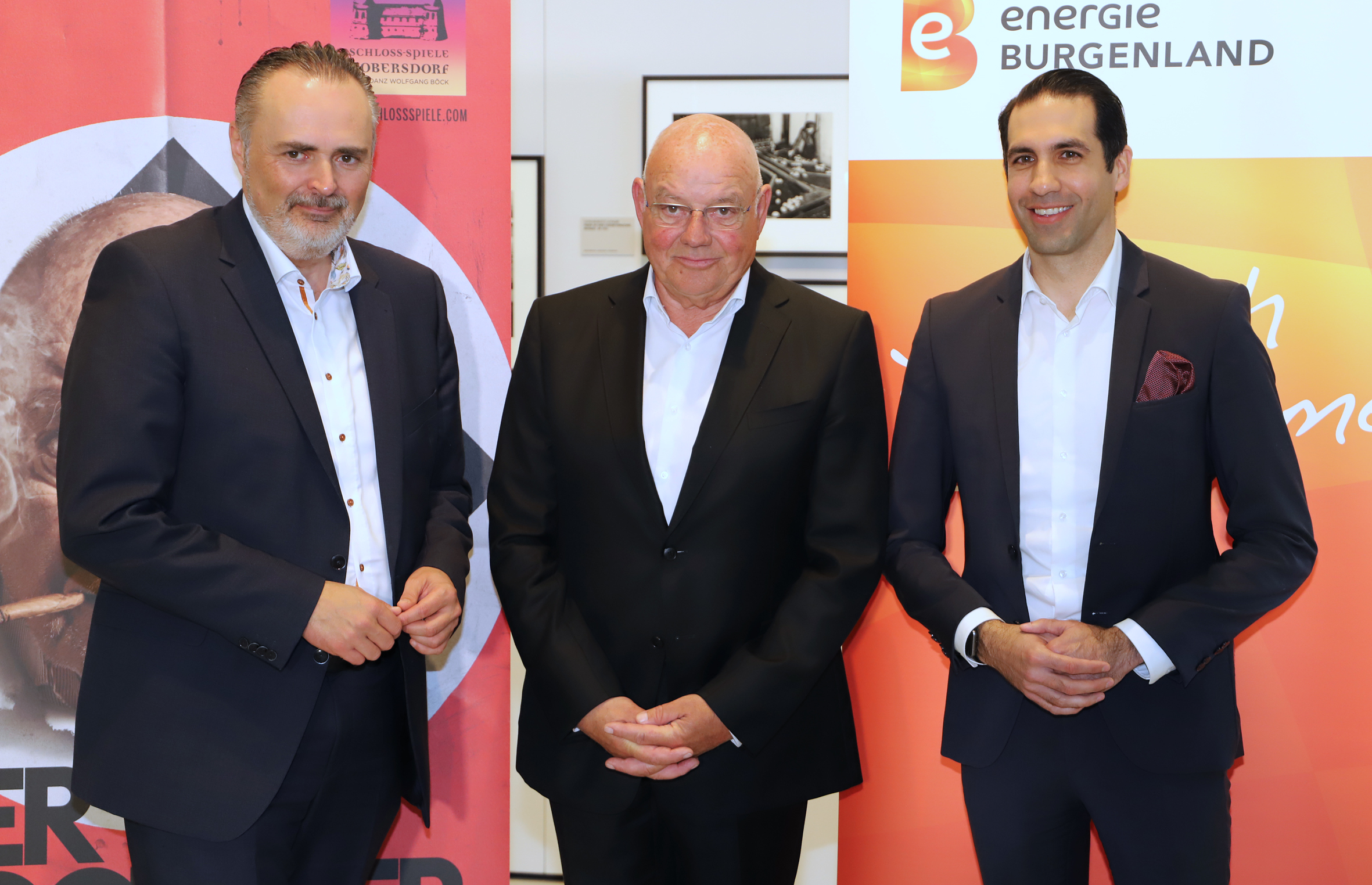 Bildtext Schloss-Spiele-Kobersdorf 1 bis 3: Mag. Thomas Mersich, Kaufmännischer Leiter Schloss-Spiele Kobersdorf, Landeshauptmann Hans Peter Doskozil, Wolfgang Böck, Intendant Schloss-Spiele Kobersdorf, Energie Burgenland Vorstandsvorsitzender Stephan Sharma und Erich Uiberlacker, der für das Bühnenbild und die Lichtgestaltung verantwortlich zeichnet, präsentierten die diesjährige Jubiläumsproduktion der Schloss-Spiele Kobersdorf (v.l.).