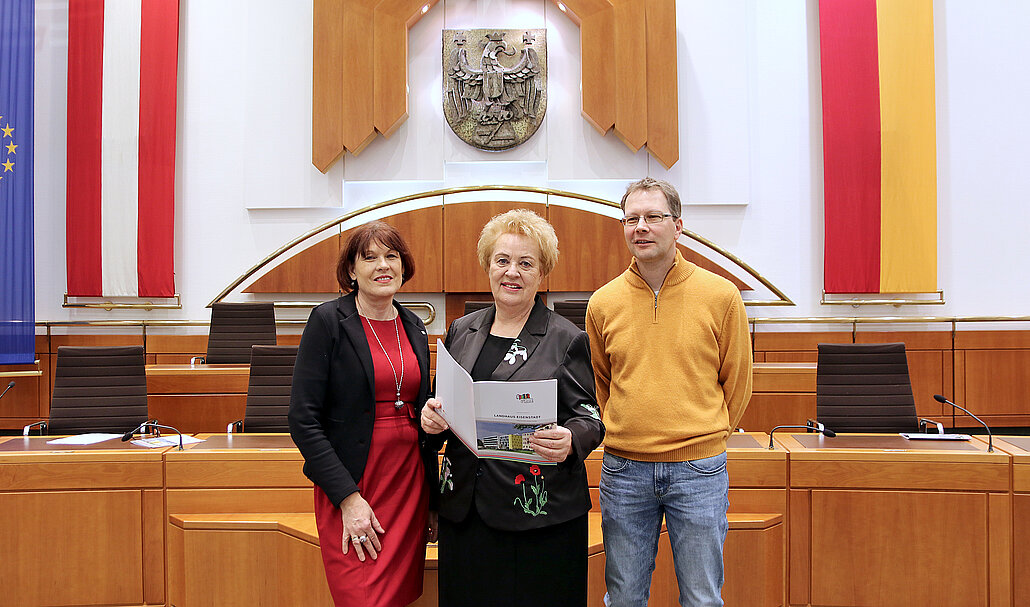 Bildtext Broschüre 90 Jahre Landhaus: Stellten anlässlich 90 Jahre Landhaus die Broschüre "Geschichte(n) eines Hauses" vor: Dr. Christine Teuschler, GF VHS Burgenland, LTPräs.in Verena Dunst, Mag. Michael Achenbach.