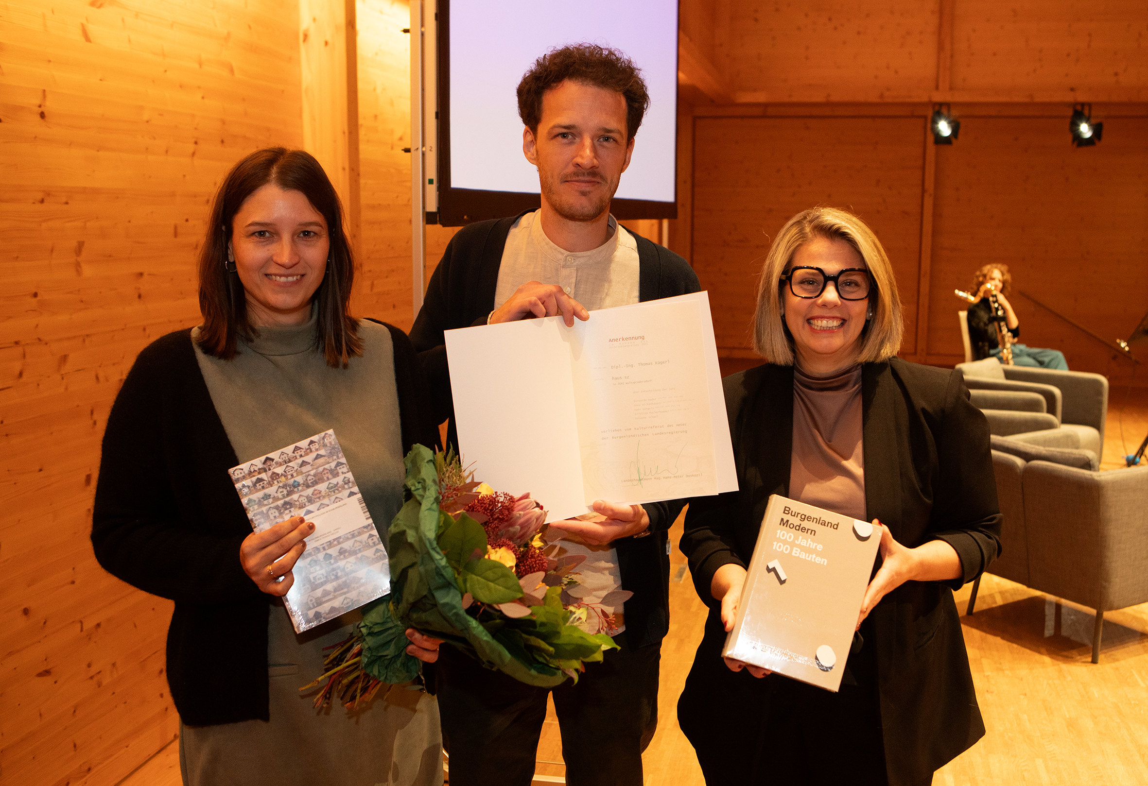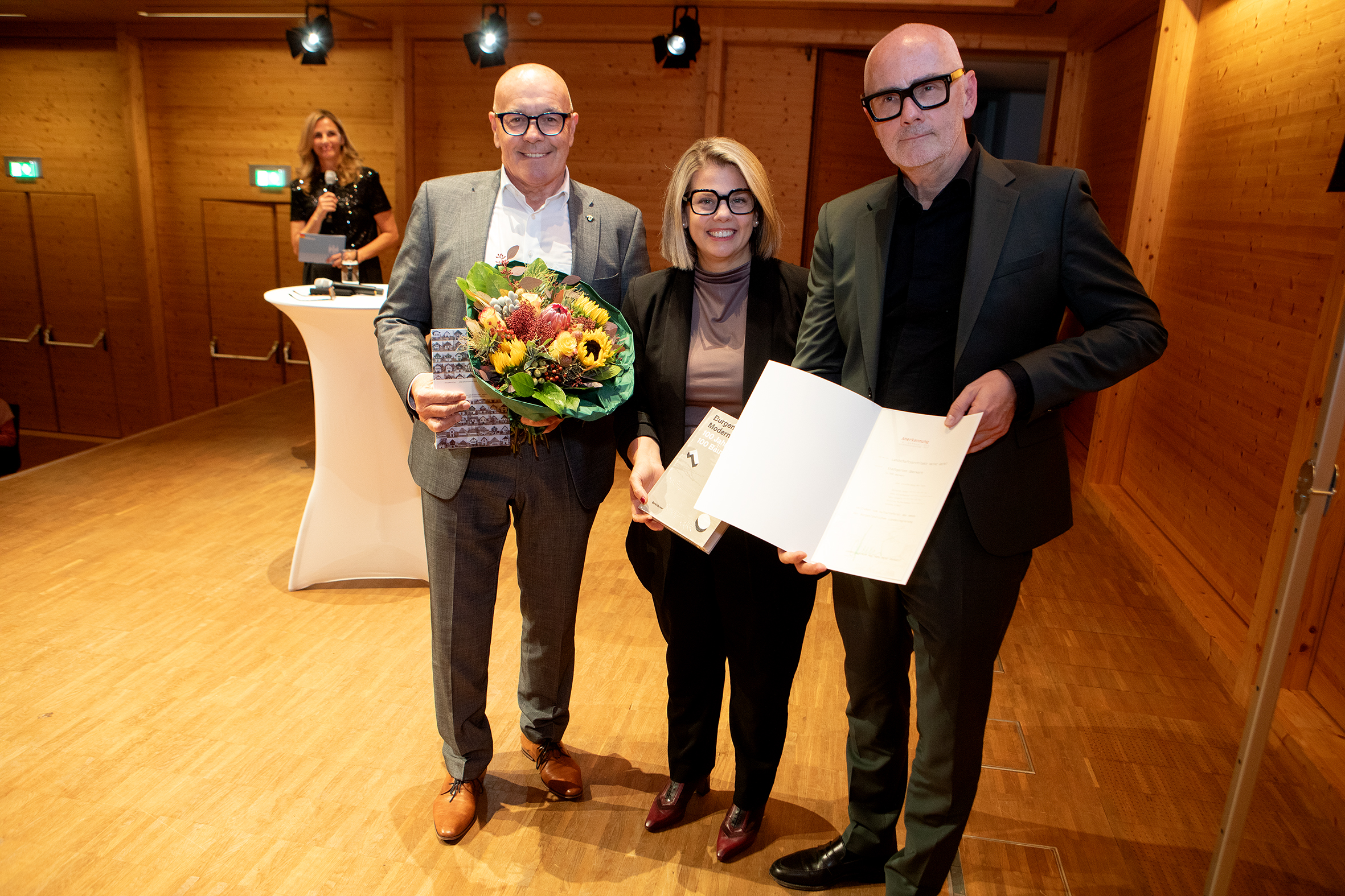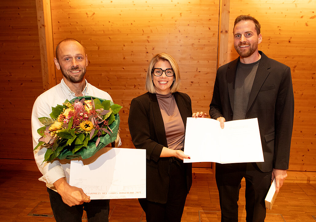 Bildtext Architekturpreis Haus mit Schilf: Geschäftsführerin Claudia Priber (KBB / Kultur Betriebe Burgenland) überreichte den Preis an Bauherr Jacobus van Hoorne und Architekt Gilbert Berthold.