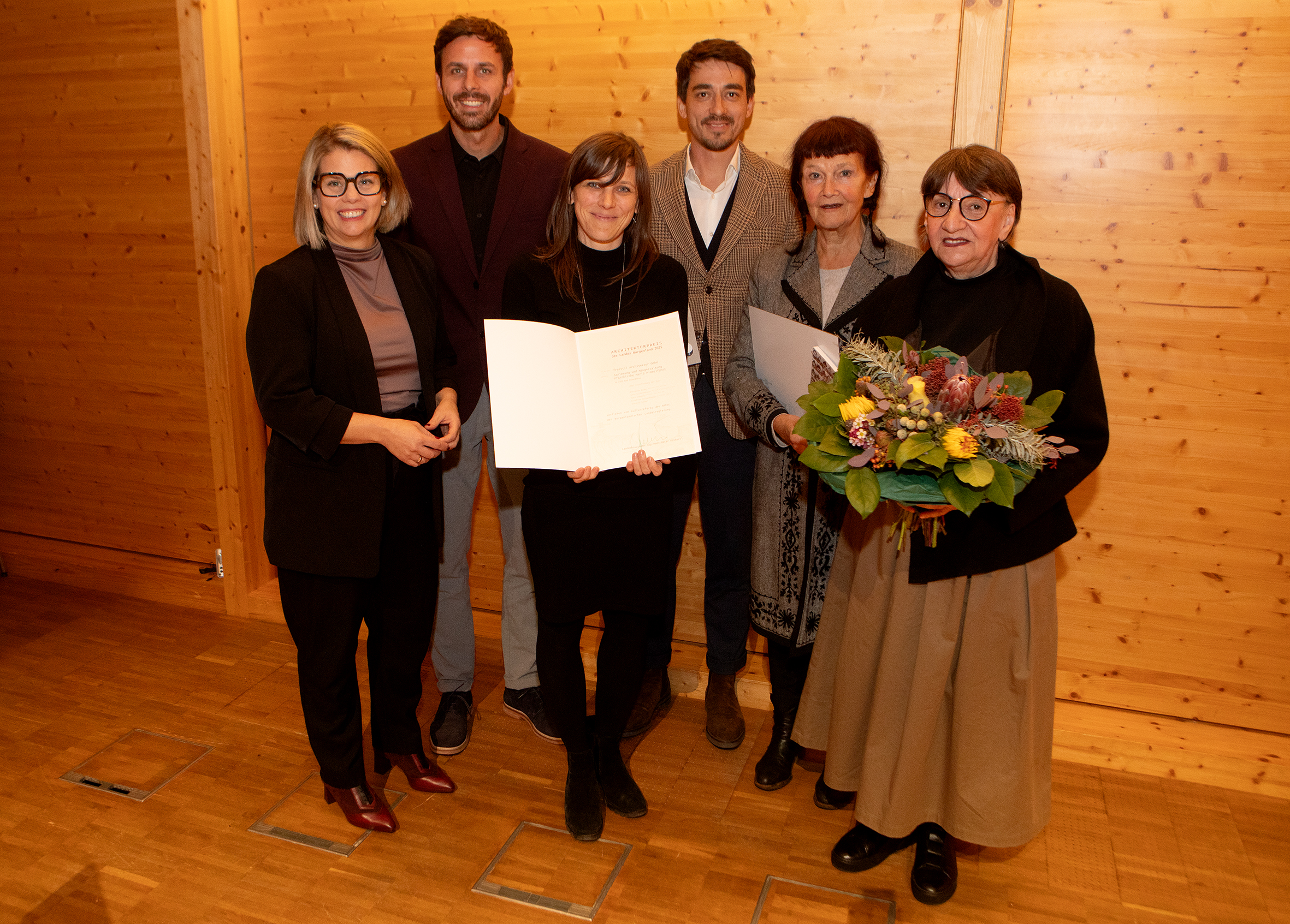 Bildtext Architekturpreis Pfarrkirche Bad Sauerbrunn: Kuratorin Gertrud Ankerl (r.) und die Architekten der freistil Architektur GmbH wurden für das Projekt der Sanierung und Neugestaltung Pfarrkirche Mariä Himmelfahrt ausgezeichnet.