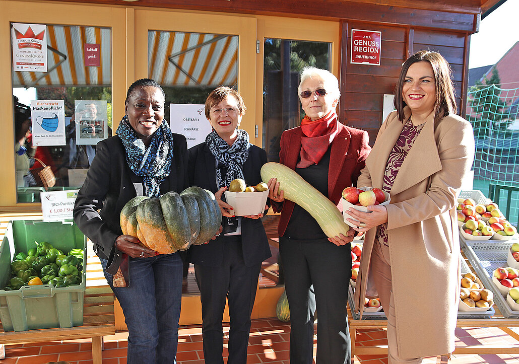 Bildtext Auma Obmana Besuch LWFS_2: Besichtigung des schuleigenen Bio-Hofladens der LWFS. v.l. Direktorin Prof. Ing. Eva Ackerl Bed MA MSc, Doris Schmidauer, Schirmherrin der Sauti Kuu Foundation, LH-Stv.in Mag.a Astrid Eisenkopf, Dr. Auma Obama, Leiterin der Sauti Kuu Foundation.