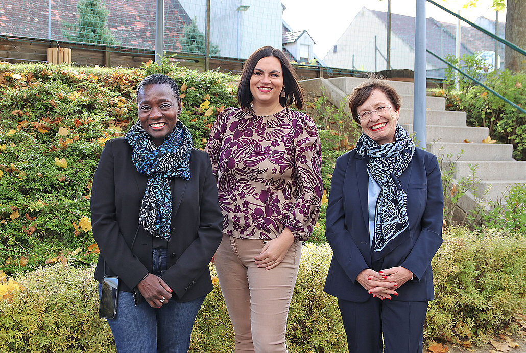 Bildtext Auma Obmana Besuch LWFS_7: Agrarreferentin LH-Stv.in Mag.a Astrid Eisenkopf mit ihren Besucherinnen im Hof der Landwirtschaftlichen Fachschule Eisenstadt.