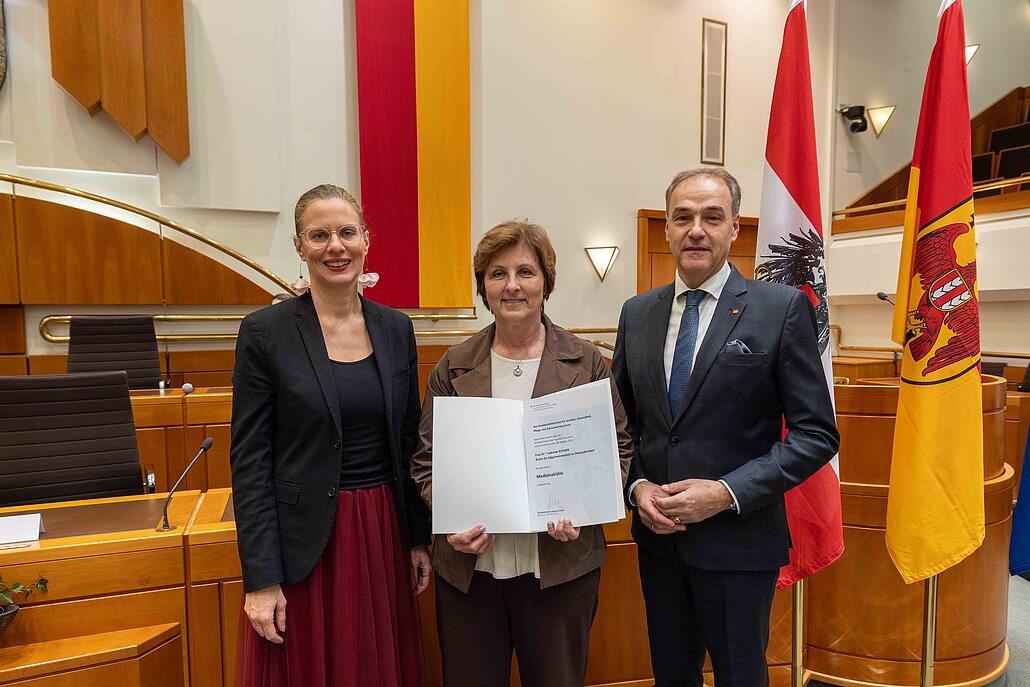 Bildtext Ehrenzeichen und Berufstitel 5: (v.l.) Landeshauptmann-Stellvertreterin Anja Haider-Wallner, Medizinalrätin Dr.in Gabriele Rother, Landesrat Leonhard Schneemann.