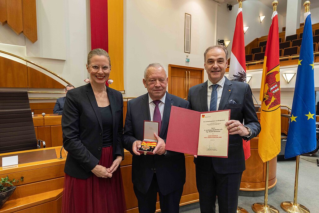 Im Rahmen eines Festaktes im Landtagssitzungssaal wurden Montagabend Auszeichnungen und Berufstitel an verdiente Persönlichkeiten des Burgenlandes aus Politik und Medizin verliehen. Landesrat Leonhard Schneemann zeichnete in Vertretung von Landeshauptmann Hans Peter Doskozil gemeinsam mit Landeshauptmann-Stellvertreterin Anja Haider-Wallner mit Entschließung der Burgenländischen Landesregierung Klubobfrau a.D. Regina Petrik und 2. Landtagspräsidenten a.D. Rudolf Strommer mit dem Komturkreuz aus. Der frühere Landtagsabgeordnete Christoph Wolf bekam das Große Goldene Ehrenzeichen überreicht. Medizinalrätin Dr.in Gertrude Winhofer wurde mit Entschließung des Herrn Bundespräsidenten der Berufstitel Obermedizinalrat verliehen. Dr.in Karin Grün, Dr. Thomas Horvatits und Dr.in Gabriele Rother wurde der Berufstitel Medizinalrätin/Medizinalrat verliehen. Die Auszeichnungen seien „ein starkes Zeichen dafür, dass unsere Gesellschaft nicht von selbst funktioniert“, betonte Landesrat Schneemann. „Heute ehren wir Persönlichkeiten aus Politik und Medizin, die nicht nur über Verantwortung gesprochen haben, sondern die sie täglich gelebt haben“, stellte Schneemann fest.
