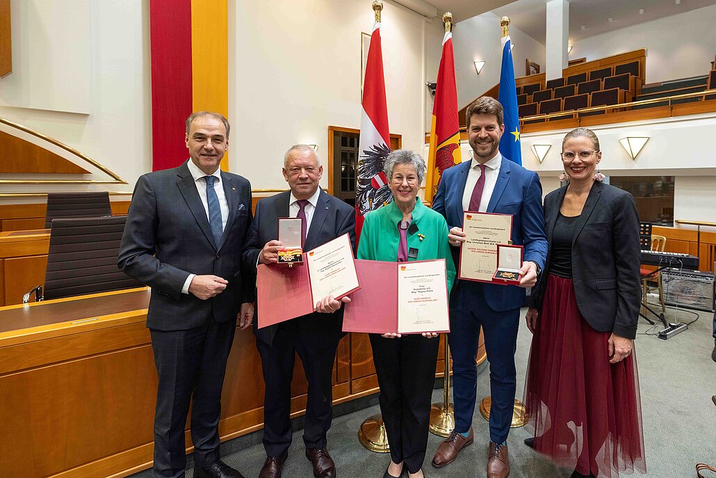 Bildtext Ehrenzeichen und Berufstitel 1: Gruppenbild mit den Geehrten (v.l.) Landesrat Leonhard Schneemann, 2. Landtagspräsident a.D. Rudolf Strommer (Komturkreuz), Klubobfrau a.D. Regina Petrik (Komturkreuz), LAbg. a.D. Christoph Wolf (Großes Goldenes Ehrenzeichen) und Landeshauptmann-Stellvertreterin Anja Haider-Wallner.
