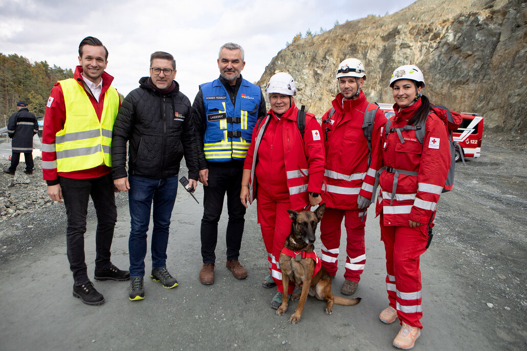 Bildtext KHD-Übung Pilgersdorf_3: Landesrat Mag. Heinrich Dorner (3.v.l.) und Landtagsabgeordneter, Bürgermeister von Markt St. Martin Jürgen Karall (2.v.l.) mit Einsatzkräften des Roten Kreuzes.