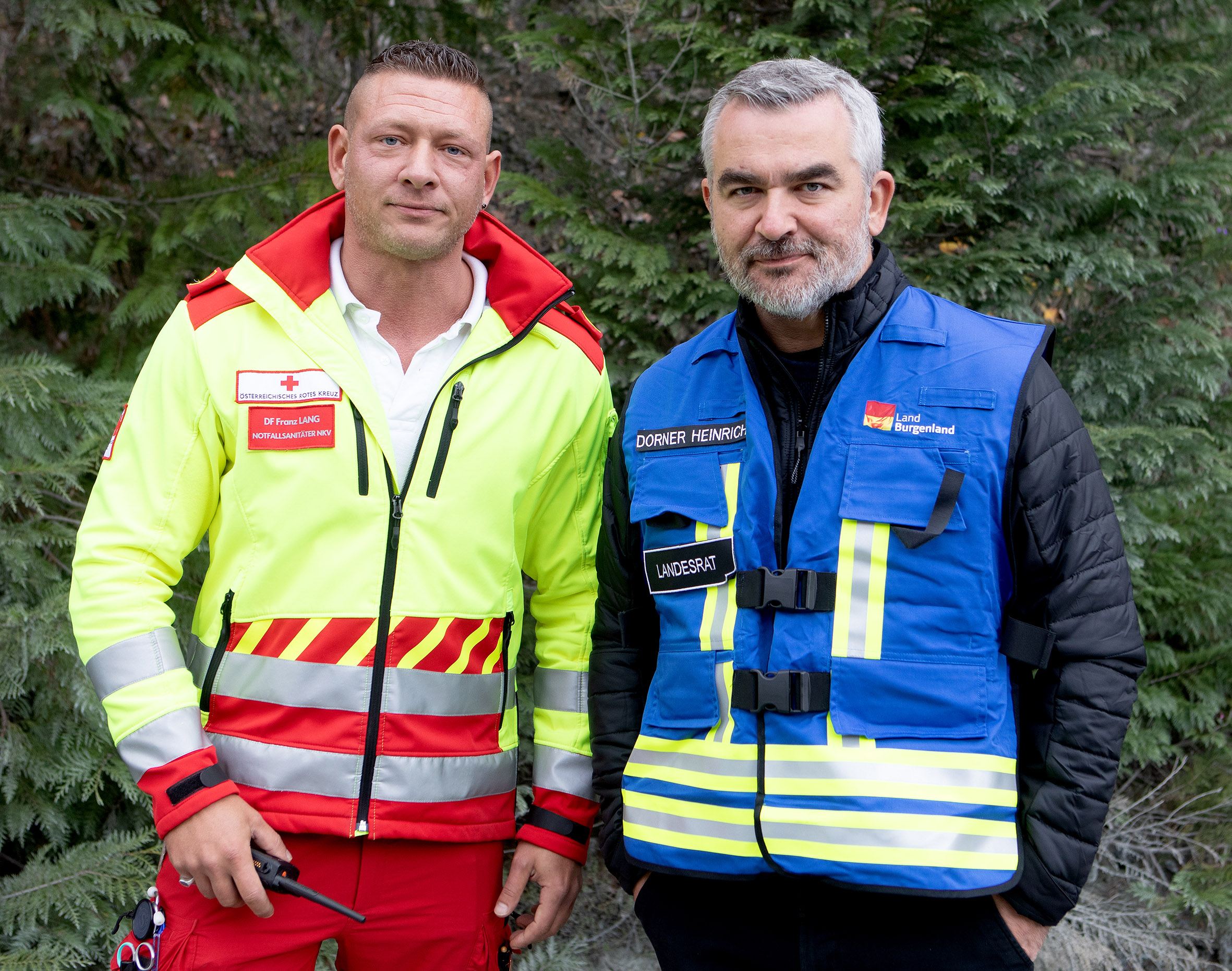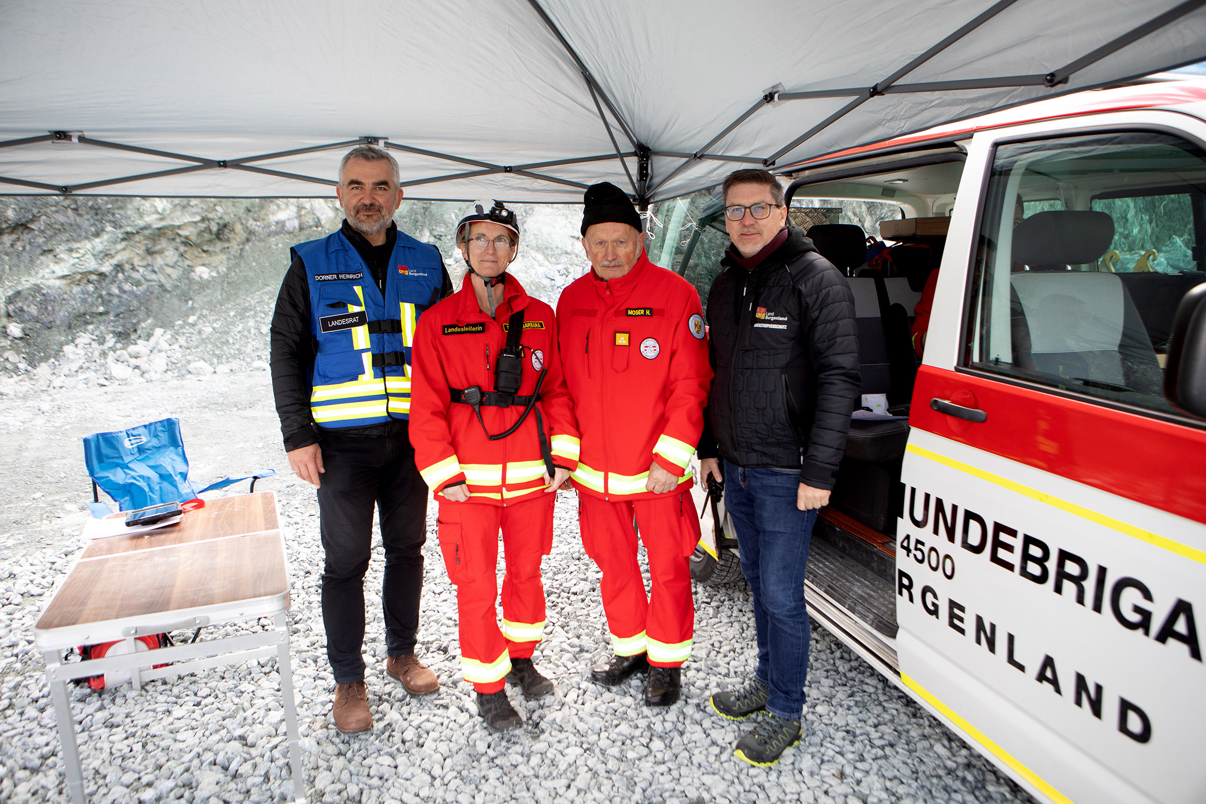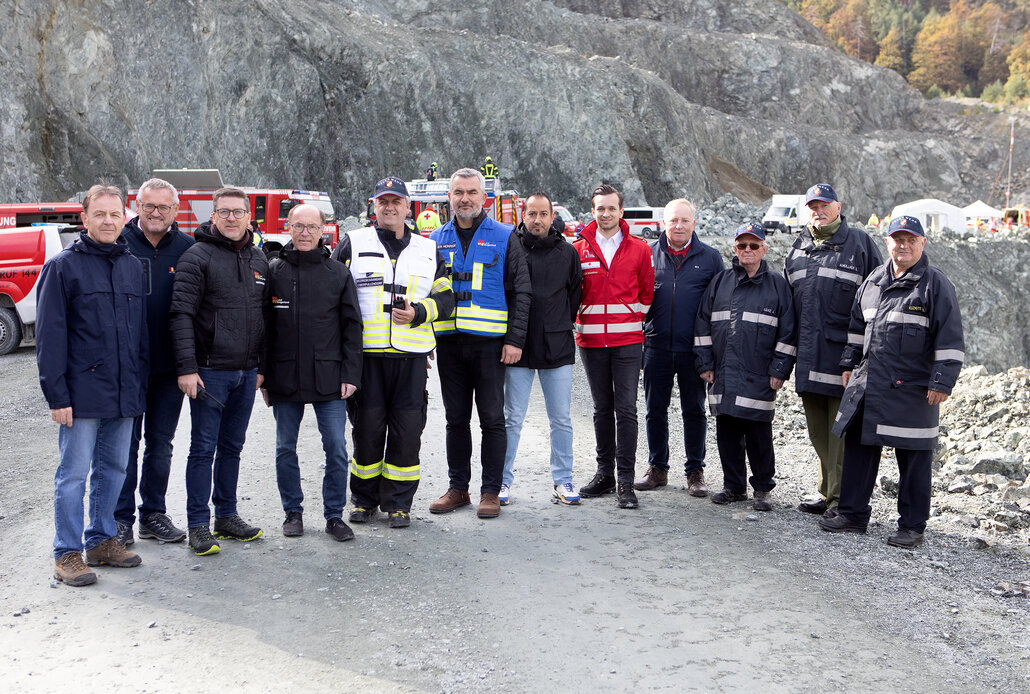 Bildtext KHD-Übung Pilgersdorf_1: Landesrat Mag. Heinrich Dorner mit Franz Lang, Notfallsanitäter (v.r.) im Zuge der Übung im Steinbruch Zöchling in Piringsdorf.