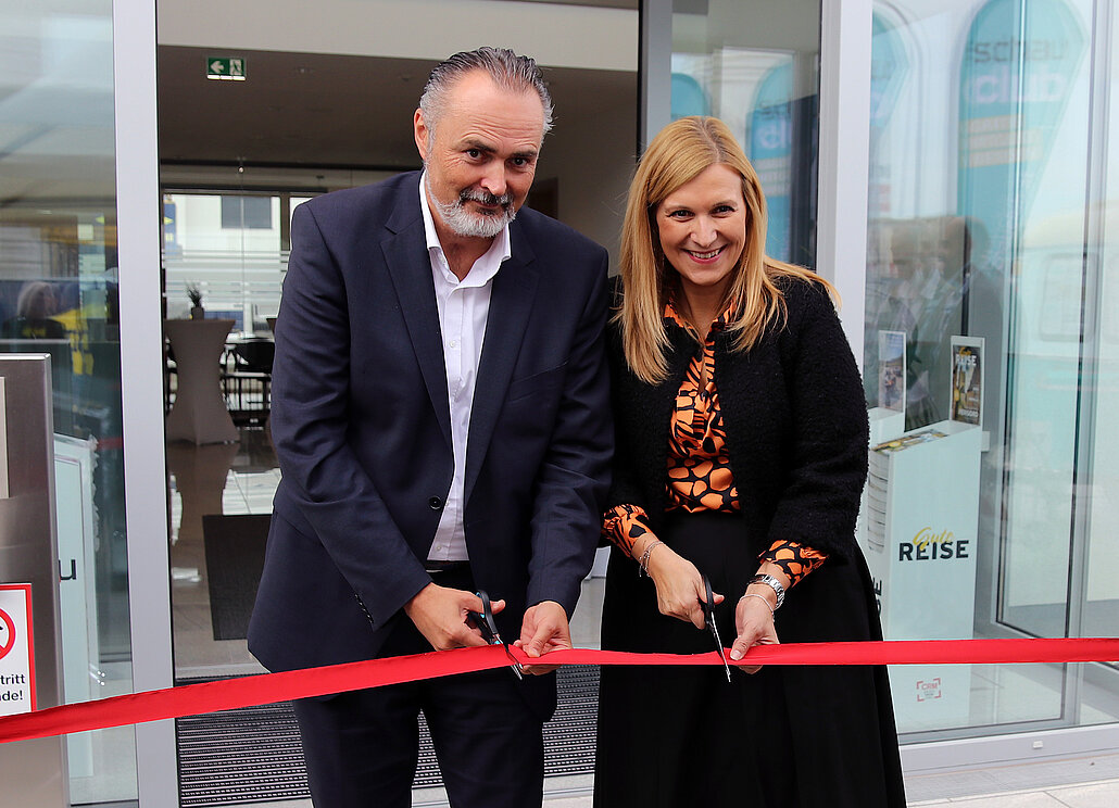 Bildtext CRM_EÖ_Parndorf_002: LH Mag. Hans Peter Doskozil und Mag.a Bettina Milletich durchschnitten zur Eröffnung ein Band.