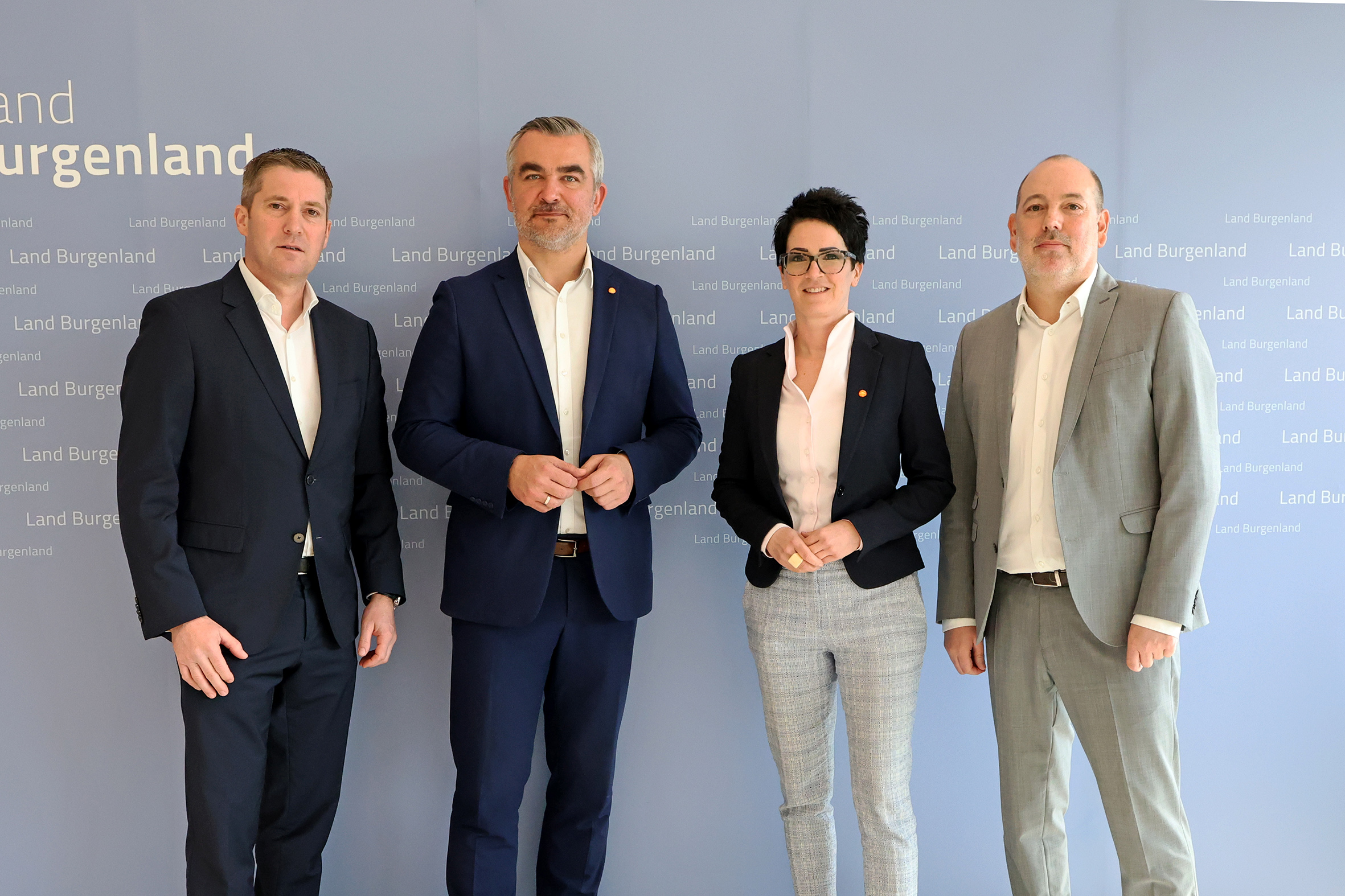 Bildtext Bauprogramm 2026: Johann Thiesz (Geschäftsführer Bau und Betrieb Burgenland – BBB), Infrastrukturlandesrat Heinrich Dorner, Jutta Benedek (Geschäftsführerin Landesimmobilien Burgenland – LIB) und Wolfgang Heckenast (Leiter der Abteilung 5 - Wasser, Klima und Energie - im Amt der Burgenländischen Landesregierung) (v.l.).