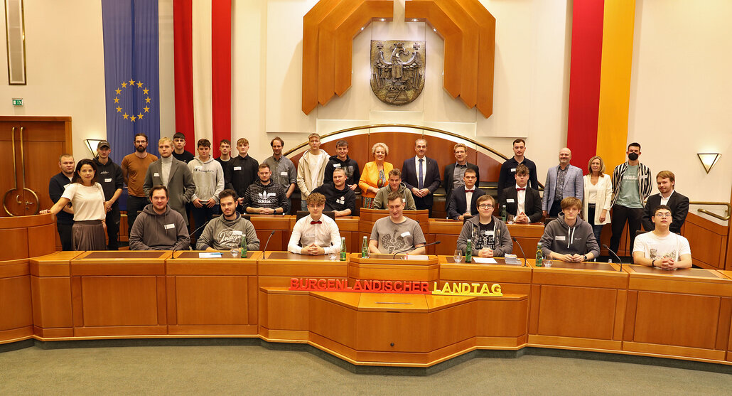 Bildtext Demokratieoffensive-Berufsschule Oberwart_2: Landtagspräsidentin Verena Dunst (Mitte vorne) mit den Landtagsabgeordneten Wolfgang Spitzmüller (2.v.l., sitzend, GRÜNE), Dipl-Päd. DI Carina Laschober (3.v.l., sitzend, ÖVP), Mag. Kurt Maczek (3.v.r., sitzend, SPÖ) und MMag. Alexander Petschnig (sitzend, 2.v.r.) sowie Auslandsdiener Jonathan Dorner (sitzend, vorne, r.) mit den Schülern sowie ihren Lehrern Tanja Illedits, BEd und Ing. Georg Krammer, BEd von der Berufsschule Oberwart im Landtagssitzungssaal.