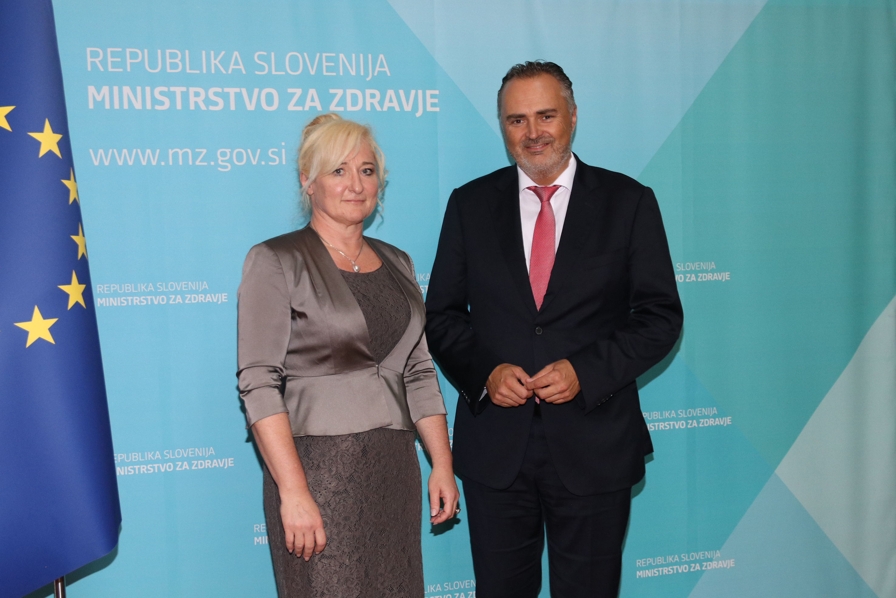 Bildtext Doskozil in Slowenien4: Auch mit der Staatsekretärin im Gesundheitsministerium, Simona Repar Bornšek, traf sich Landeshauptmann Hans Peter Doskozil (v.l.) zu einem Arbeitsgespräch.