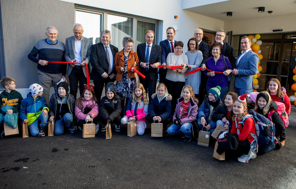 Bildtext Eröffnung Pflegewohnhaus Redlschlag_3: Landesrat Dr. Leonhard Schneemann (5.v.l., hinten) mit Geschäftsführer Dr. Johannes Zsifkovits (r., Soziale Dienste Burgenland), Bürgermeisterin Renate Habetler und alle Beteiligten mit den Kindern, die den Festakt feierlich umrahmten.