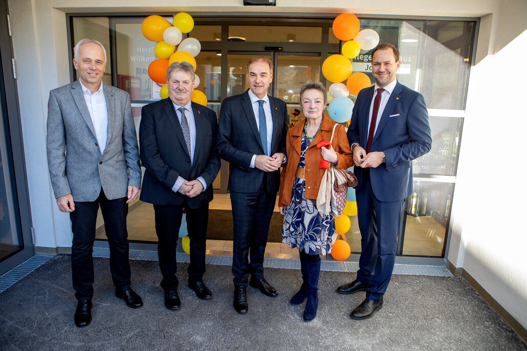 Bildtext Eröffnung Pflegewohnhaus Redlschlag_1: Landesrat Dr. Leonhard Schneemann (Mitte) eröffnete gemeinsam mit Geschäftsführer Dr. Johannes Zsifkovits (r., Soziale Dienste Burgenland), Bürgermeisterin Renate Habetler (2.v.r.) und den Vizebürgermeistern Gerald Derkits (l.) und Wilhelm Böhm (2.v.l.) das Pflegewohnhaus Redlschlag.