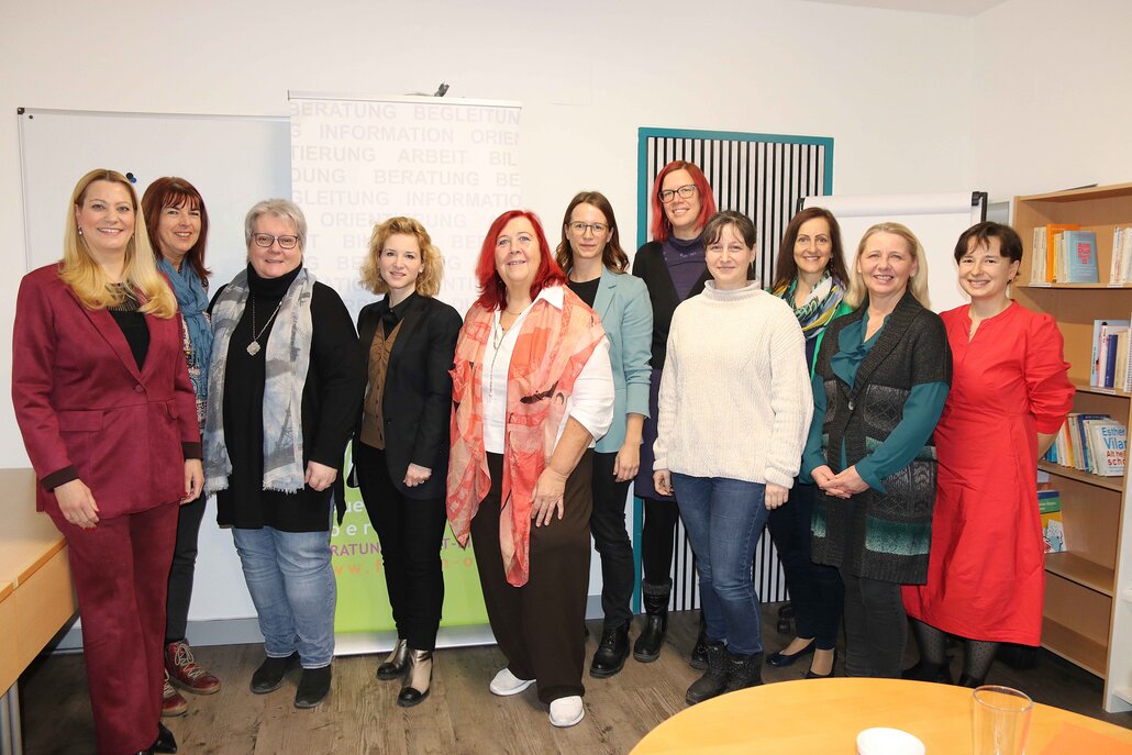 Bildtext Besuch BM Holzleitner 2: Frauenministerin Eva-Maria Holzleitner (4.v.l.) und Landesrätin Daniela Winkler (links im Bild) besuchten gemeinsam die Frauenberatungsstelle Oberpullendorf.